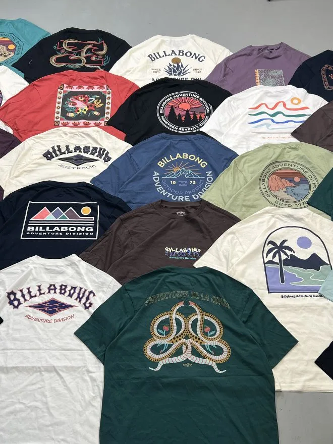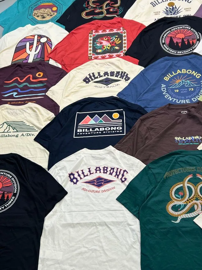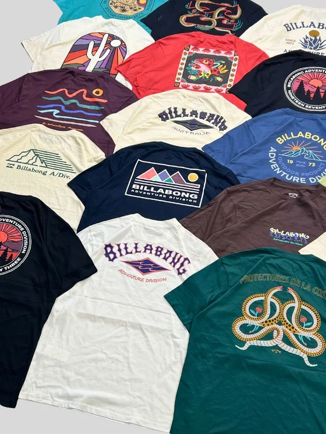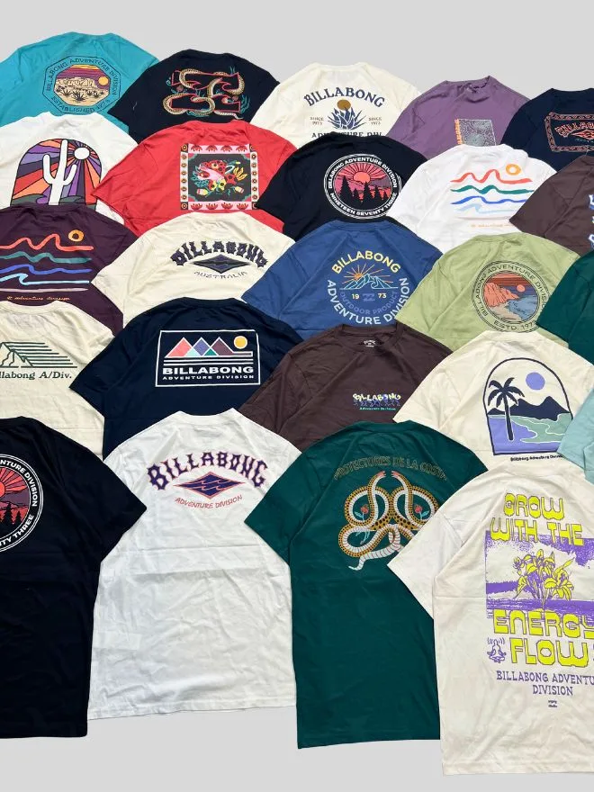Introducing a large wholesale bundle of Billabong graphic t-shirts, featuring a wide mix of colors, prints, and signature adventure-inspired designs. From minimal logos to bold back graphics, each piece reflects the iconic surf & streetwear aesthetic of Billabong.