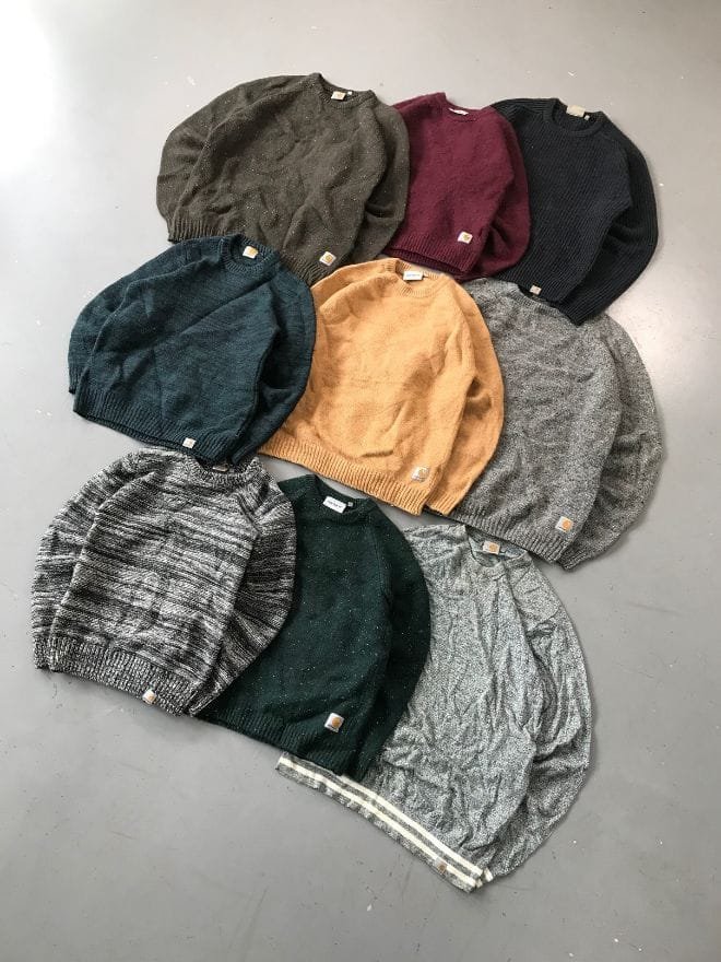 This incredible bundle features 10 vintage Carhartt knit sweaters, offering classic workwear style and enduring warmth.