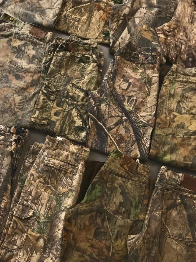 Style Mix: A variety of cargos, jeans, and possibly other camo-inspired apparel featuring the classic Realtree pattern.