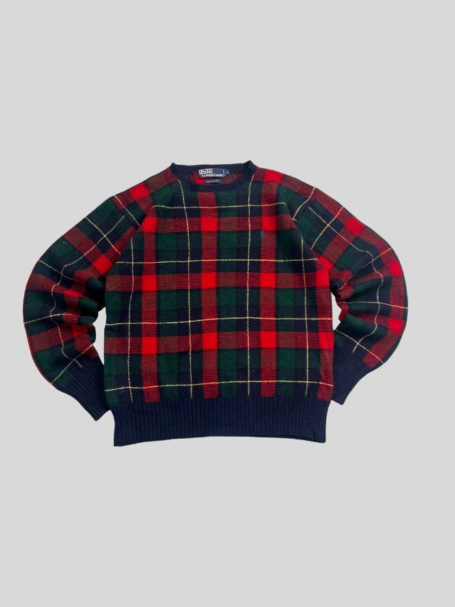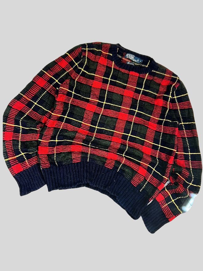 Both sweaters showcase Polo Ralph Lauren’s timeless design language with eye-catching multicolor plaid patterns and a relaxed vintage silhouette. These pieces are ideal for layering and offer a strong retro aesthetic that works well with casual, preppy, or vintage-inspired outfits.