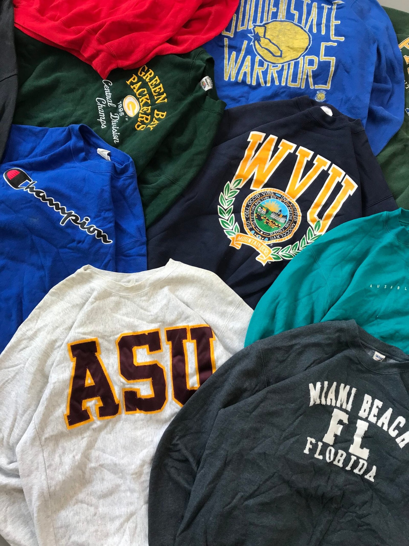 Style Mix: Crewnecks, hoodies, college logos, and graphic prints