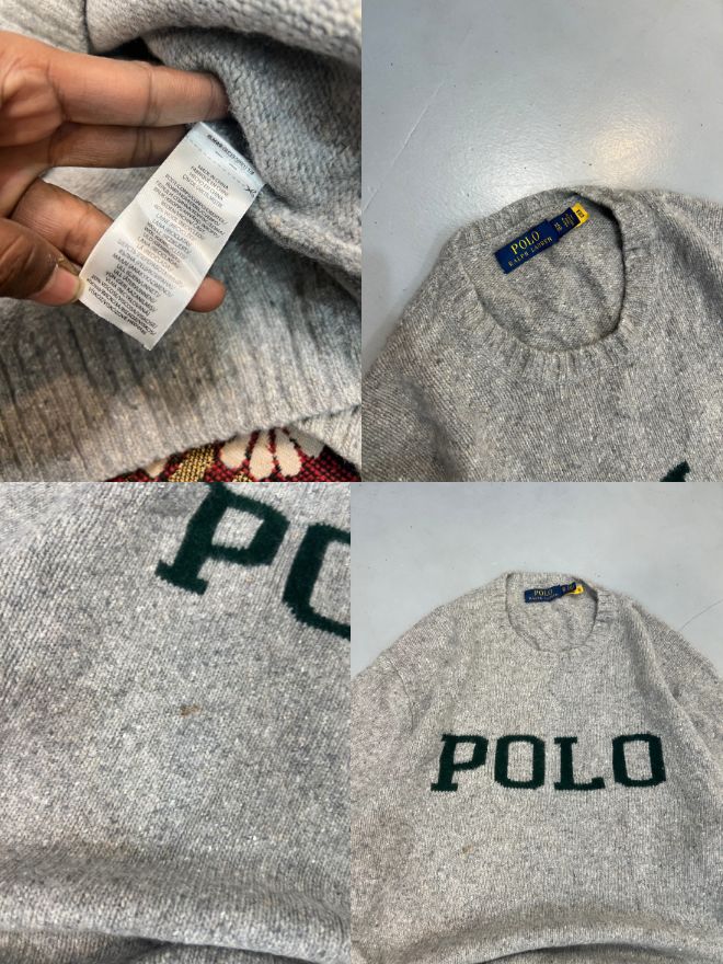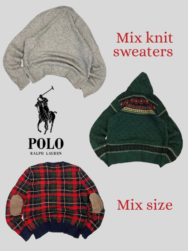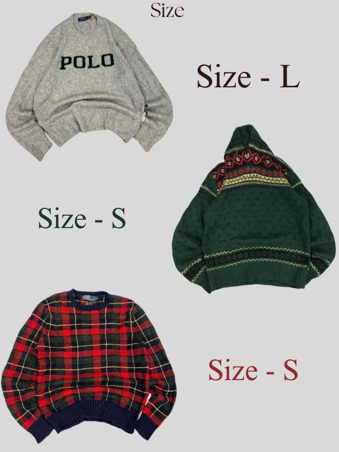 Bundle of three authentic vintage Polo Ralph Lauren knit sweaters, featuring bold multicolor, classic gray, and timeless blue styles in both men’s and women’s sizes. Each sweater carries unique vintage character with premium knit quality. Perfect for collectors, resellers, or wardrobe refresh.