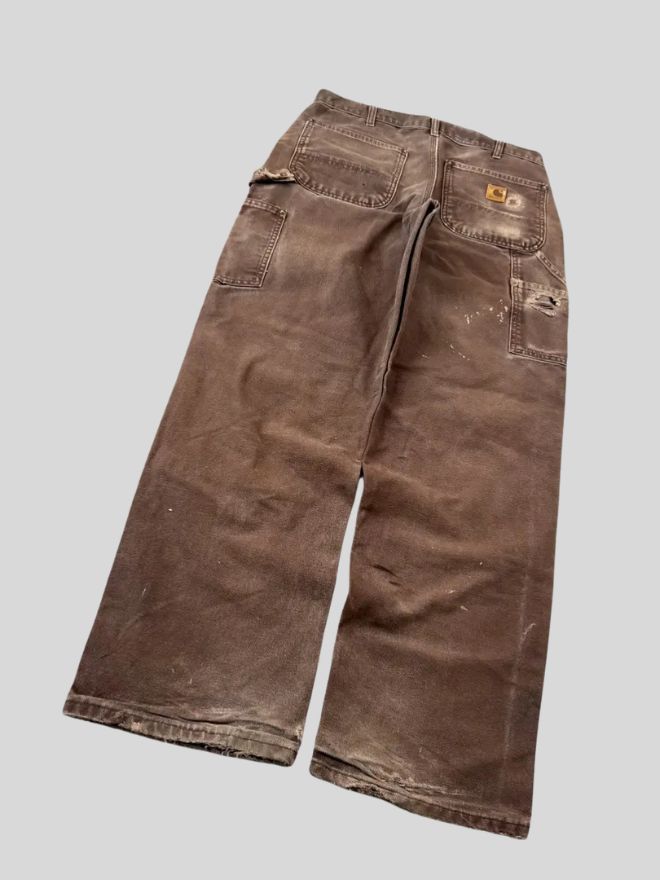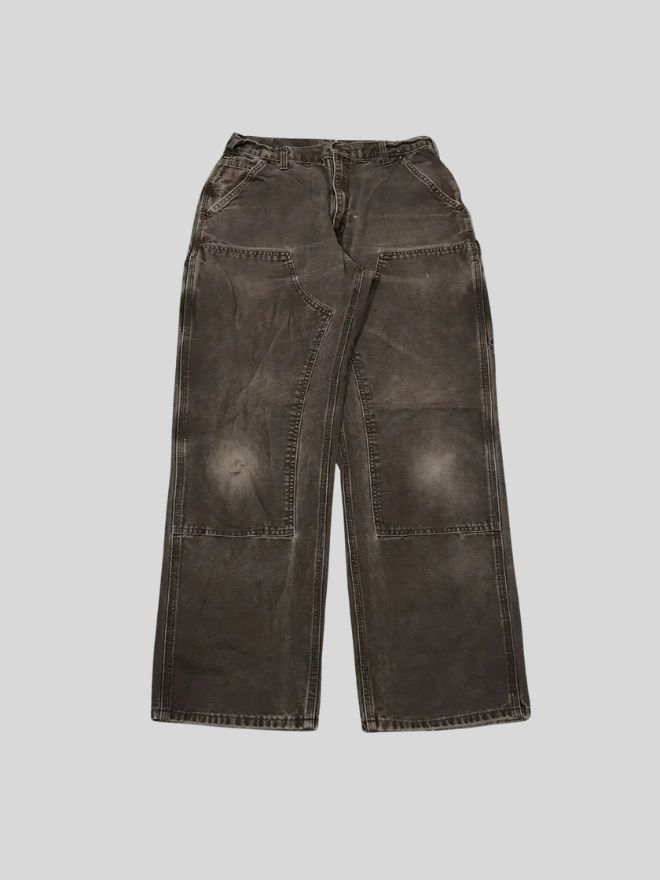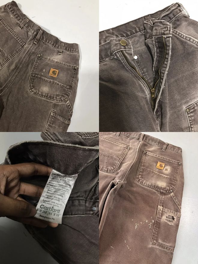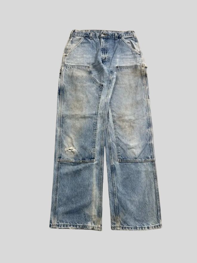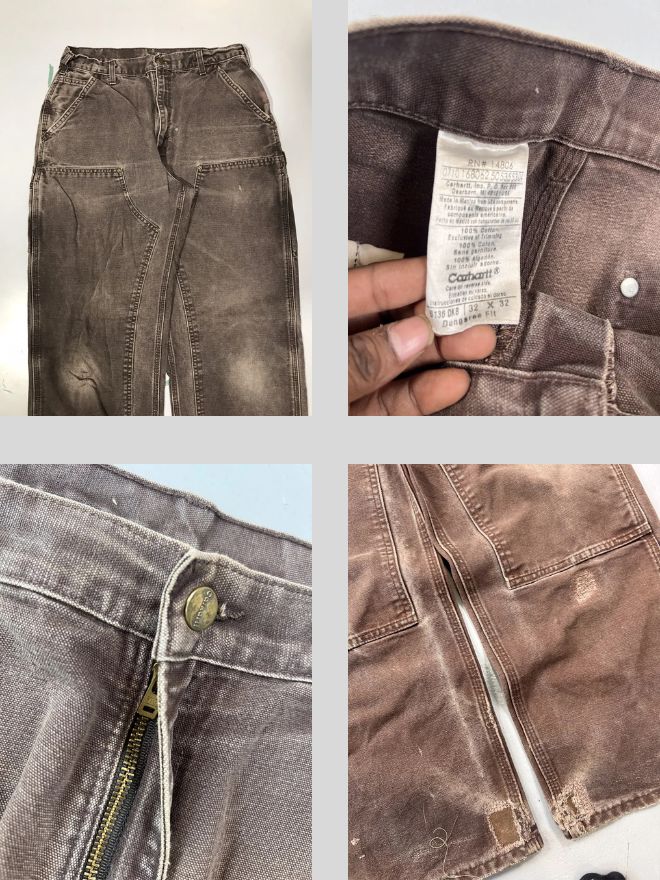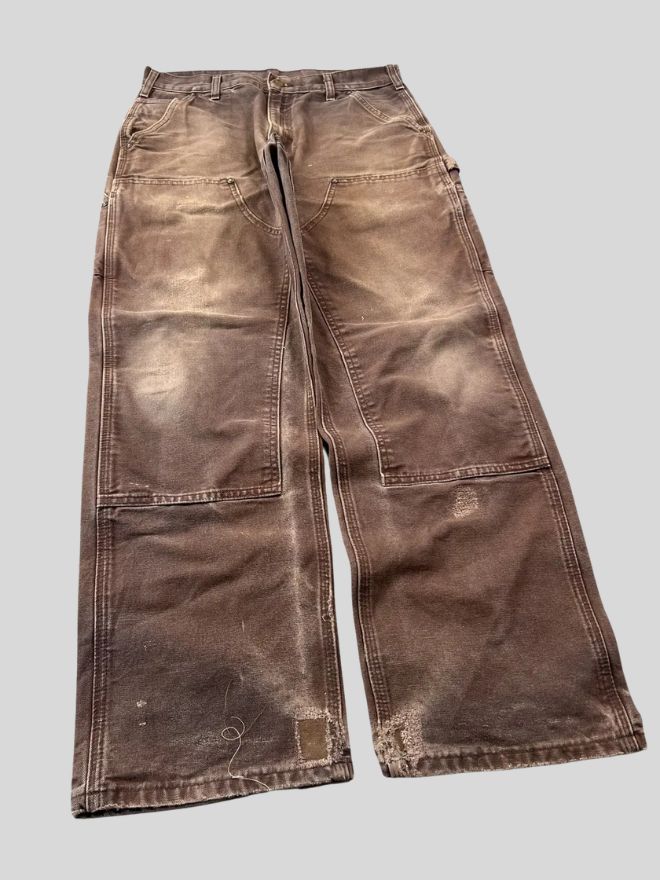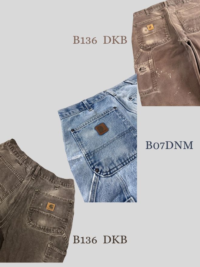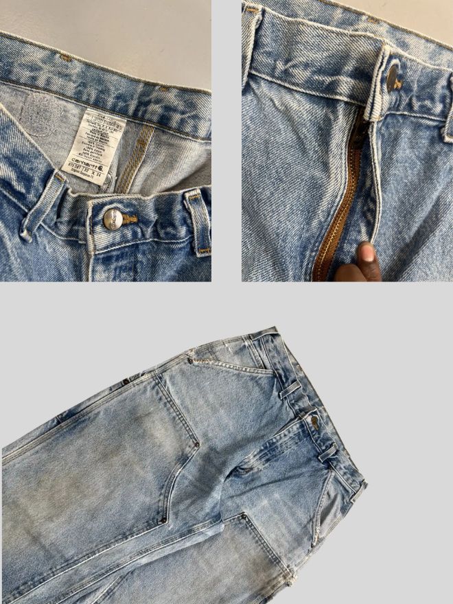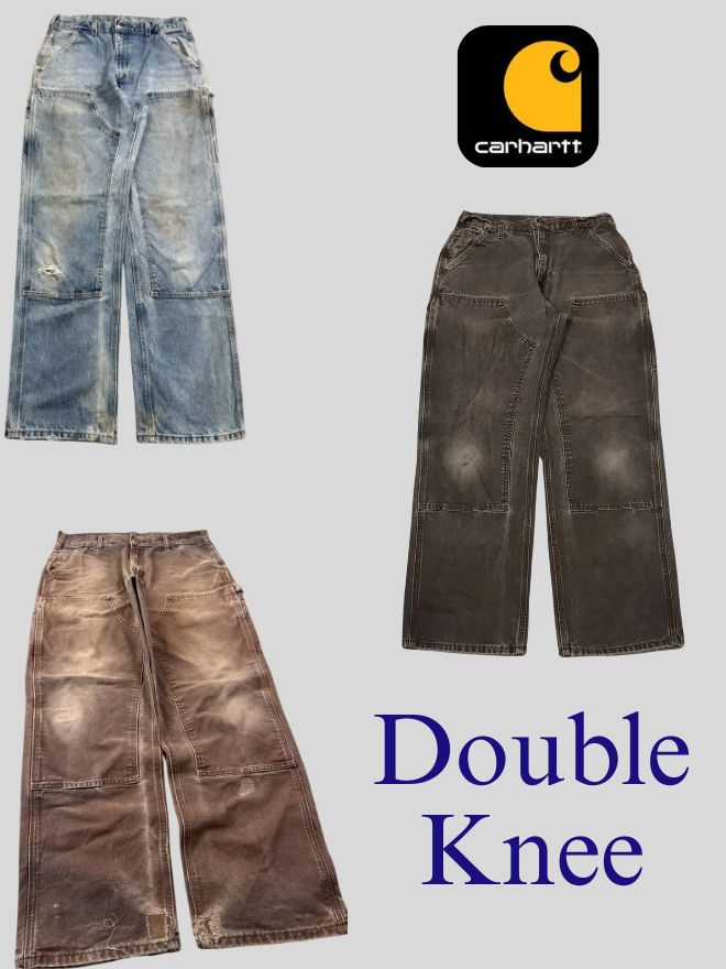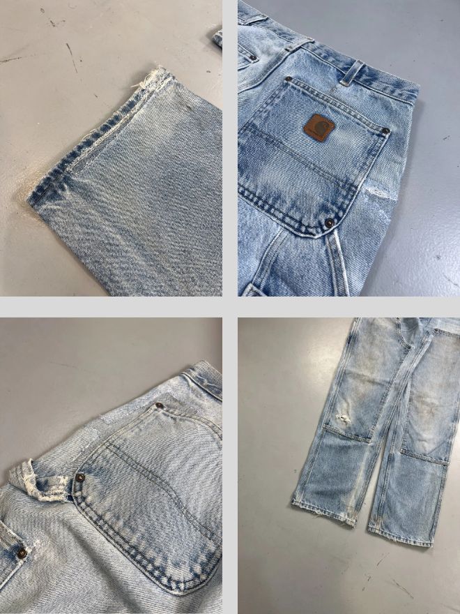 This bundle includes 3 pieces of authentic vintage Carhartt double knee workwear denim, featuring heavy-duty construction and iconic double knee reinforcement. These pants showcase beautiful natural fading, distress, and wear that only true vintage workwear develops over time.