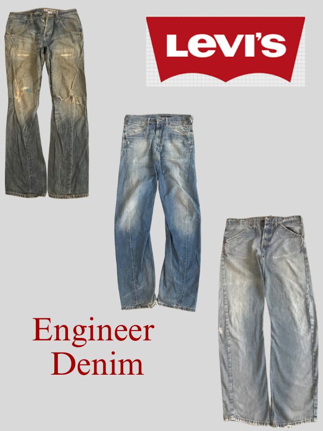 This bundle includes three vintage Levi’s engineer jeans denim — all genuine Levi’s workwear pieces with classic engineering details, rugged construction, and authentic worn-in character. Engineer jeans are known for their functional design inspired by traditional workwear, featuring straight or generous leg fits, durable denim, and practical details like tool-ready silhouettes.
