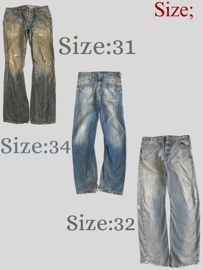This bundle features used vintage denim with varying degrees of wear, including fading, minor damage, and natural distressing. These condition traits are typical for true vintage engineer jeans and add authentic character. Please review all photos carefully and feel free to ask for additional details.