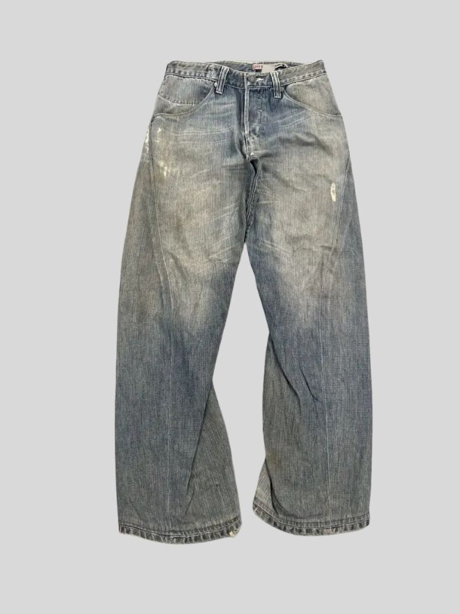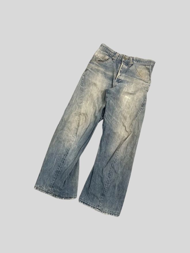 These jeans come in used vintage condition, showing natural fading, fraying, distress, and wear that give each piece a unique aged character. Every pair has been measured flat, and the images provided are for reference to the type and condition of items included.