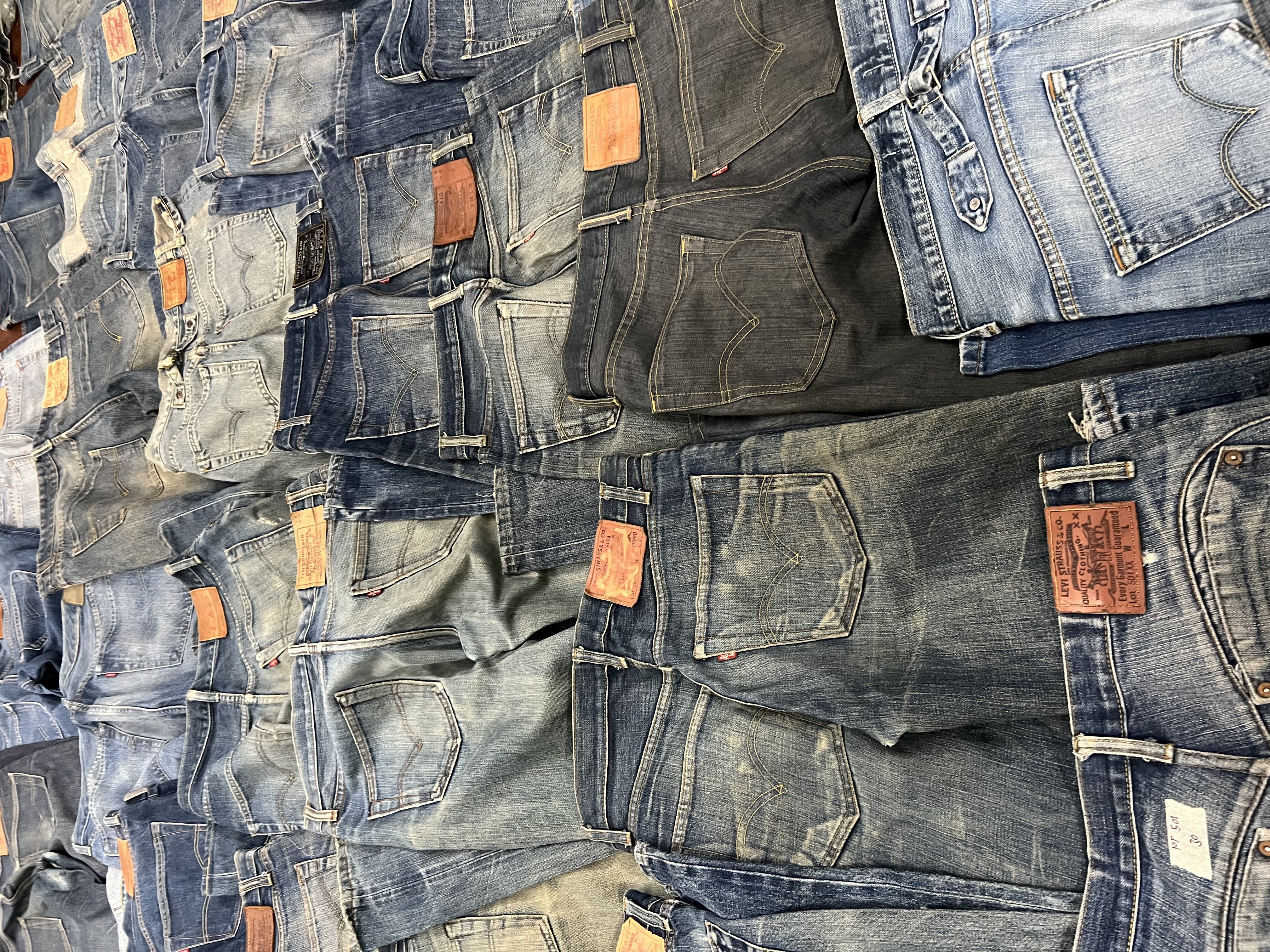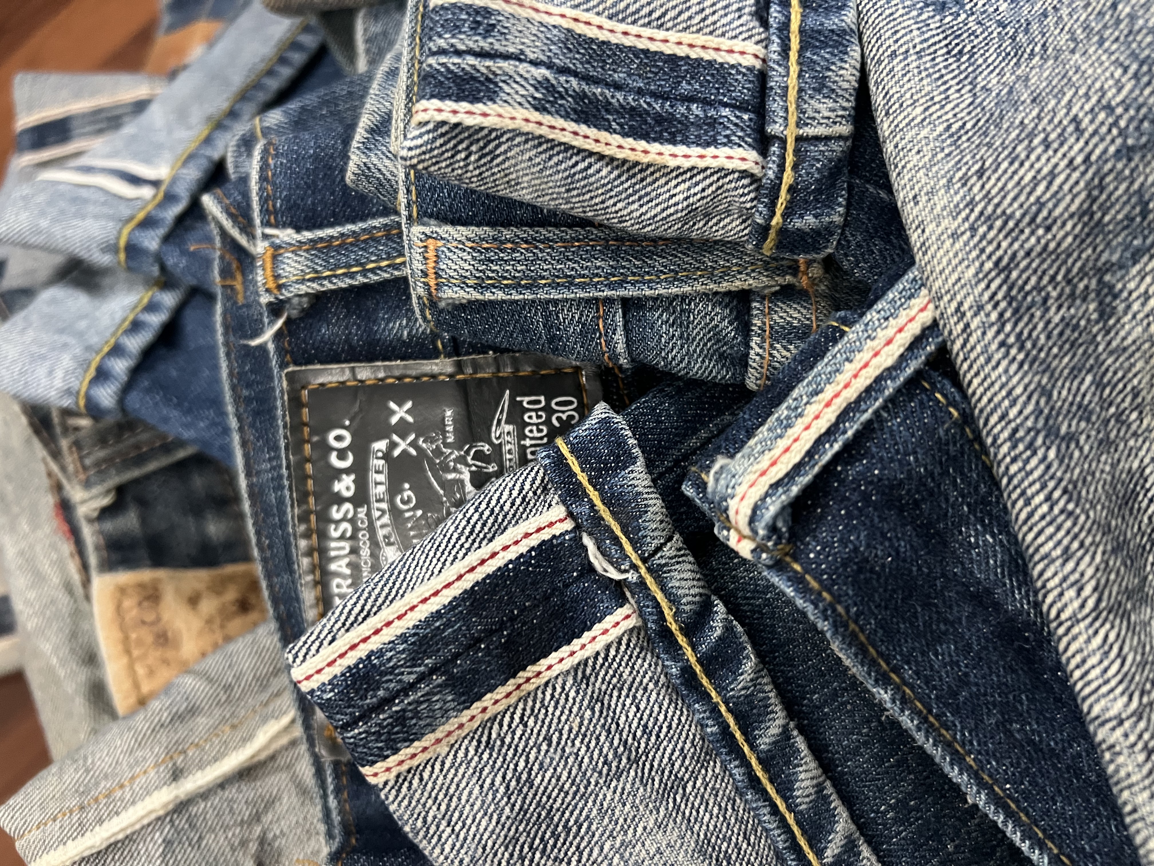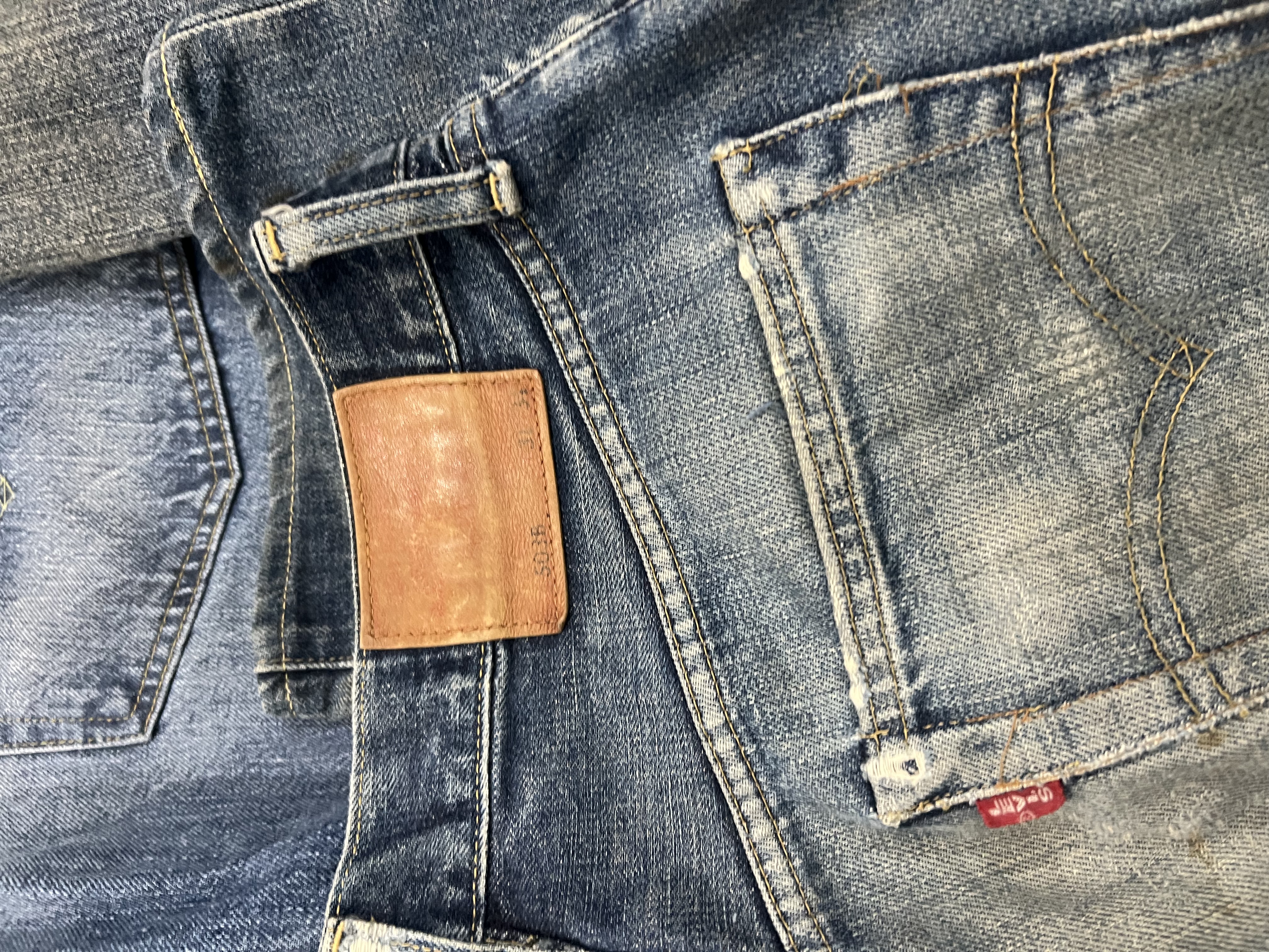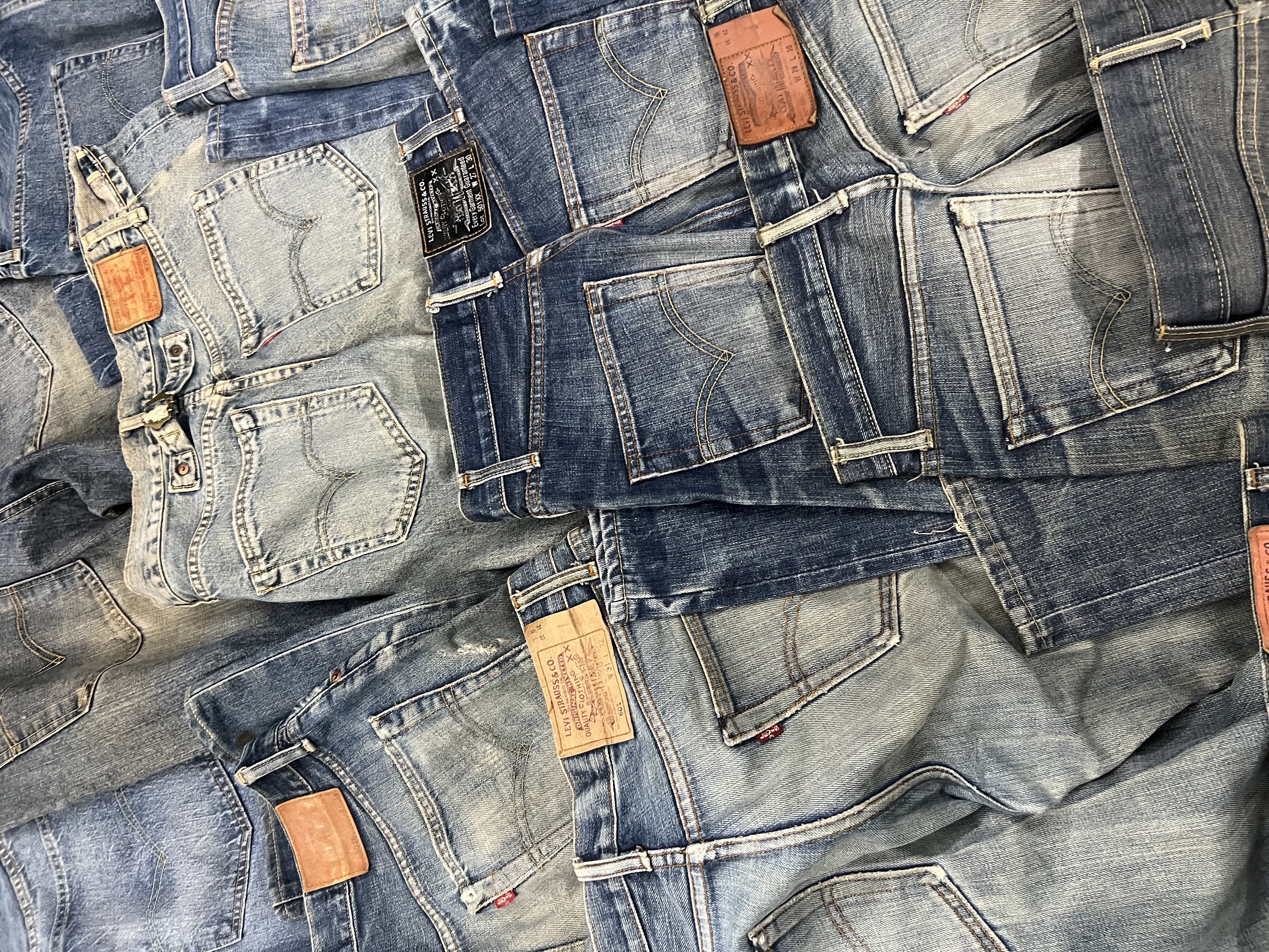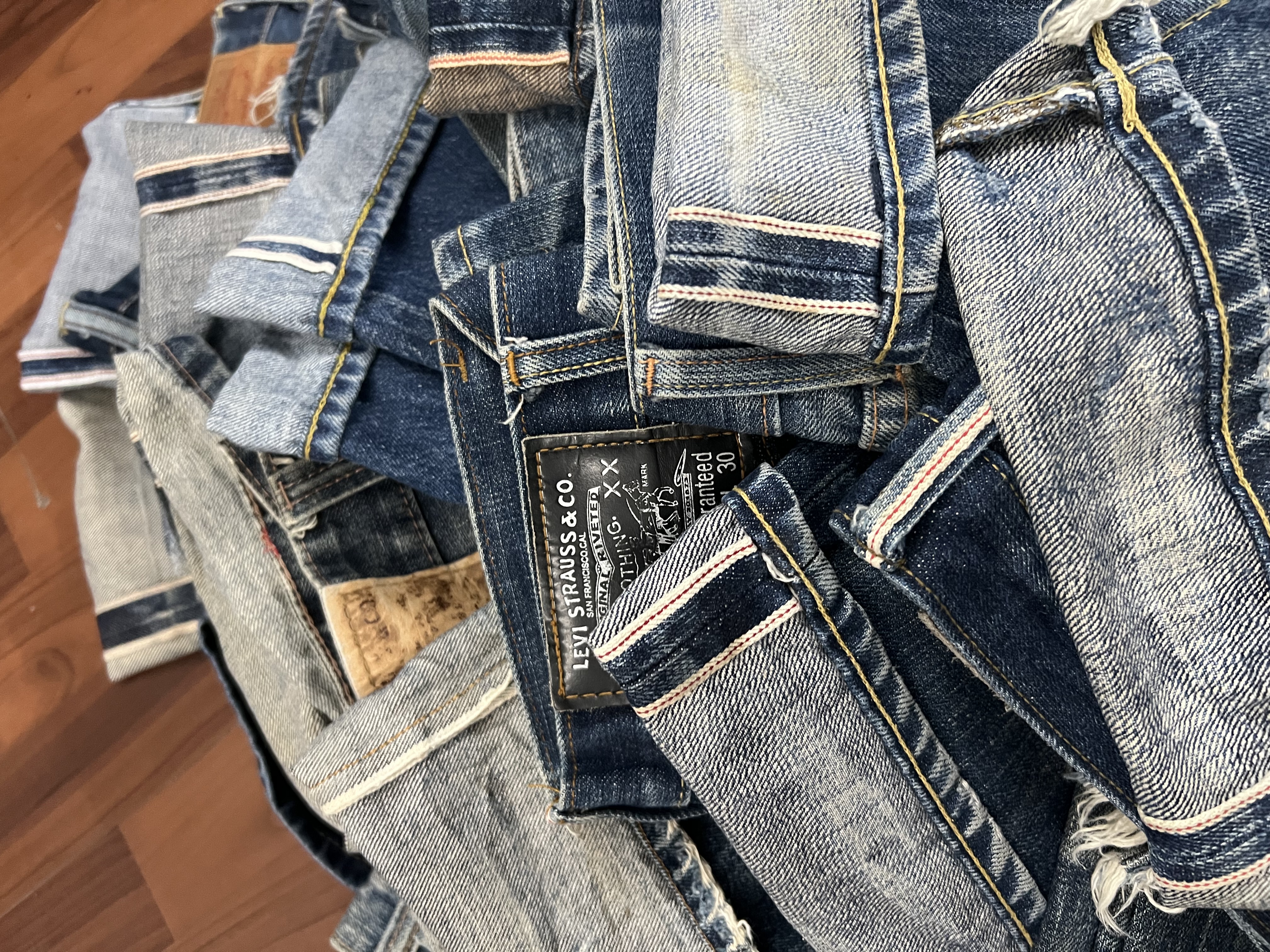 Bundle of vintage Levi’s selvedge denim, mixed codes, sizes 28–36, Grade A/B, used condition.