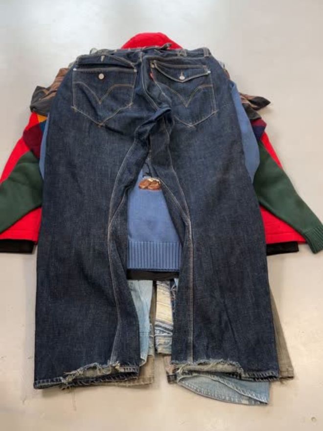 Items are in mixed vintage condition, generally ranging from good to very good, with some showing signs of wear such as fading, distressing, or minor repairs. These characteristics are typical of vintage and factory leftover garments and add to their authentic appeal.