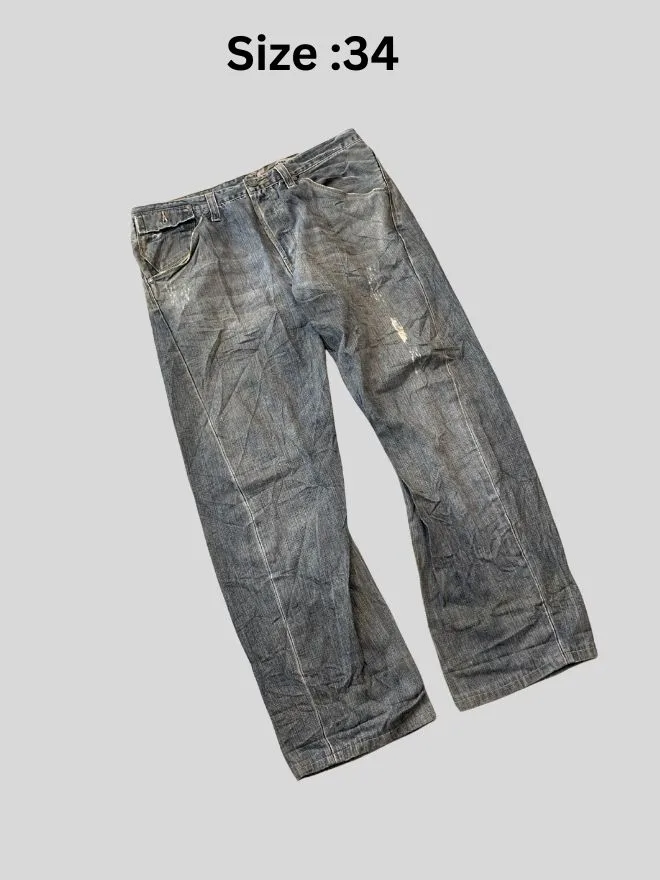 Bundle deal of 4 vintage Levi’s engineer denim jeans in classic blue wash. Includes sizes 30 and 34 with various measurements. Avant-garde workwear style. Used condition with some damages—please review measurements and photos carefully.