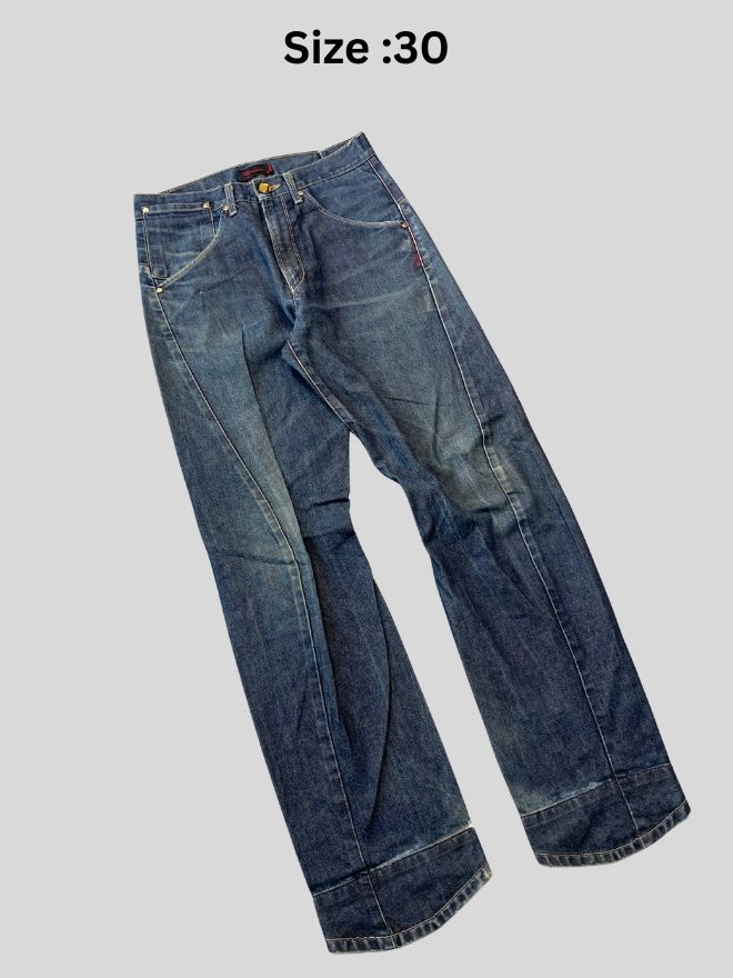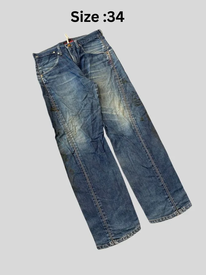 Each pair features durable denim construction and a structured silhouette associated with engineer/workwear styles. These jeans carry authentic vintage character with natural wear and fading. One pair also includes a buckle belt detail for a more distinctive look.