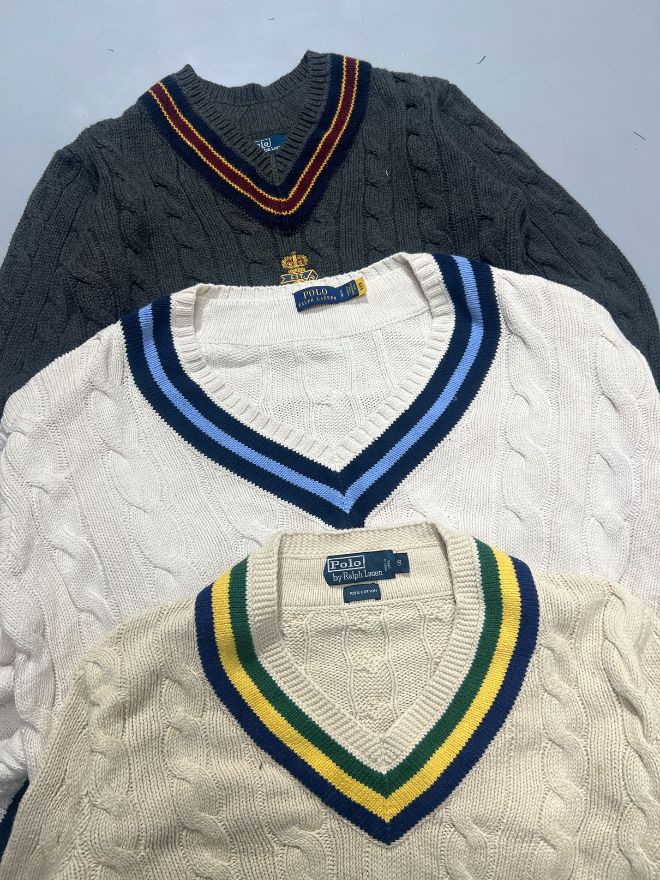 Bundle of vintage Polo Ralph Lauren V-neck cricket knit sweaters. Sizes range from S to L. Grade AB. Good wearable condition — perfect for resellers, bulk buyers, and vintage stores.