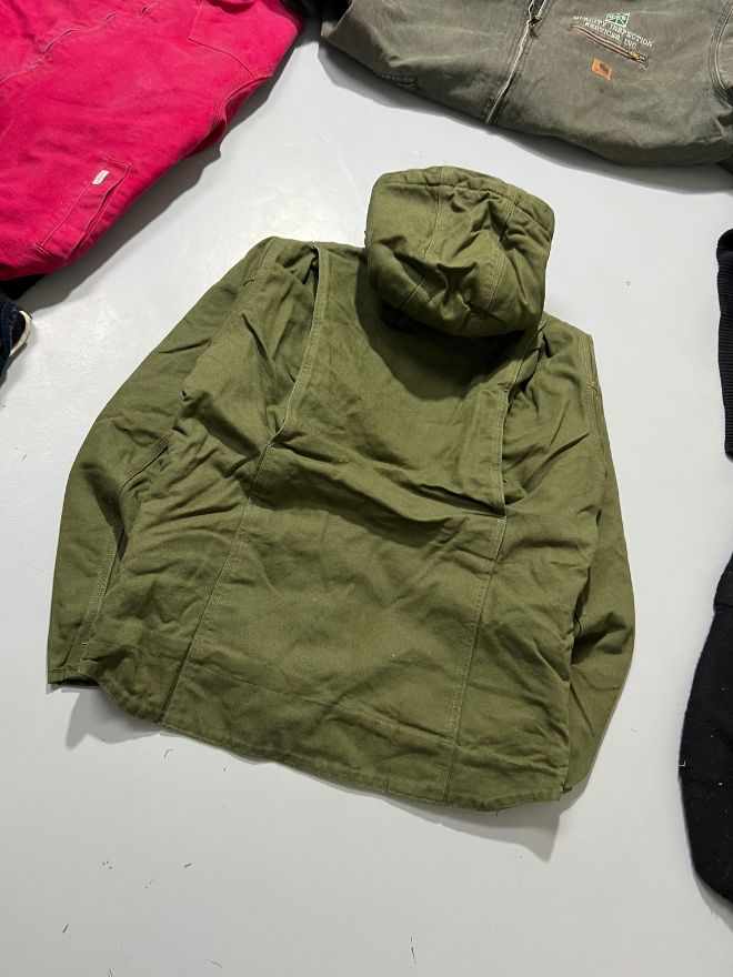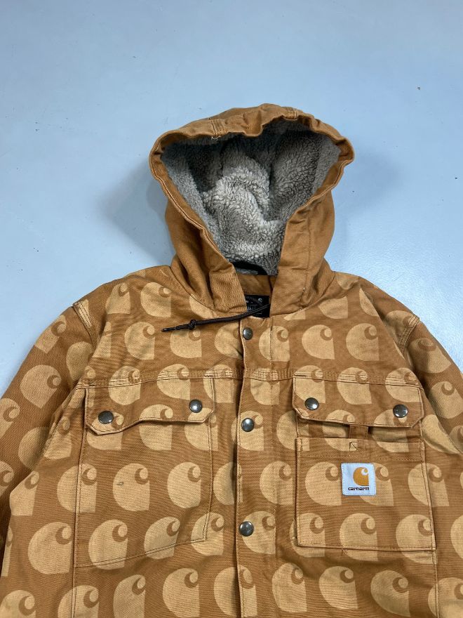Vintage factory-leftover Carhartt sherpa-lined jacket in beige. Authentic workwear piece with warm sherpa interior, durable outer shell, and a perfectly worn vintage character. Men’s Size M. Great condition—just needs a wash. Measurements included below.