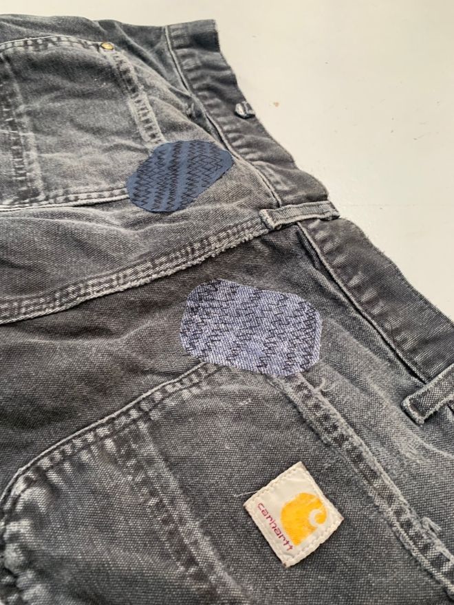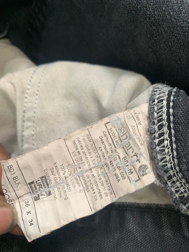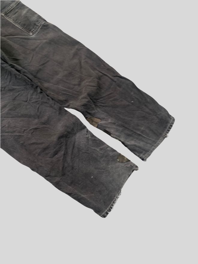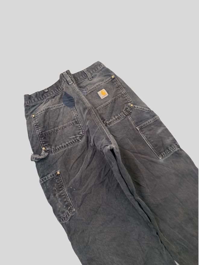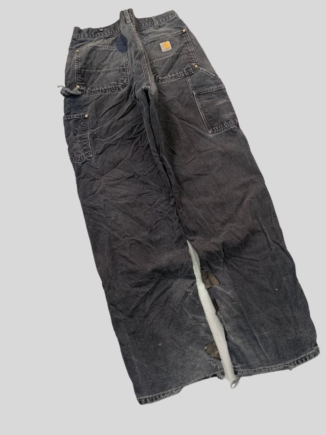 Authentic vintage Carhartt B01 BLK double knee workwear denim in black. Size 34 with 43” length. Repaired damage and light dusty stains — rugged, durable, and ready to wear.