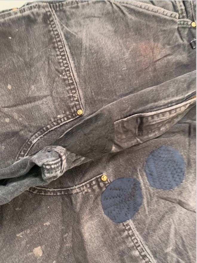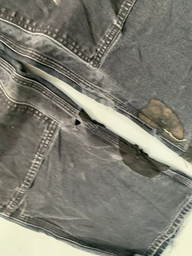 This pair features authentic signs of wear, including light dusty stains and previously damaged areas that have been repaired. The repairs maintain functionality while adding character to the overall rugged aesthetic.