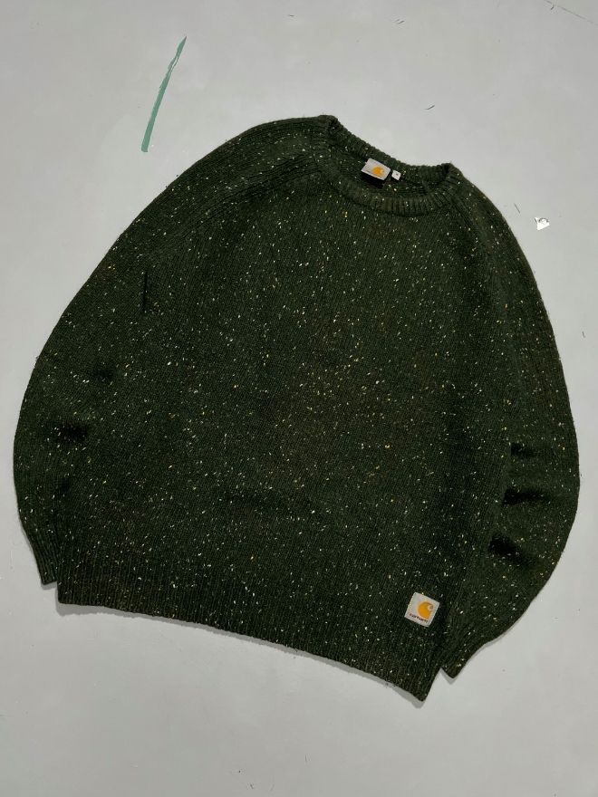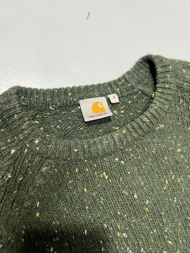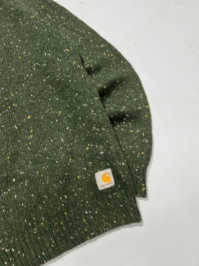 Rare vintage Carhartt speckled knit sweater in Green. Men’s Size M. 100% Acrylic. Classic Carhartt badge on hem. Perfect streetwear layering piece in great vintage condition.