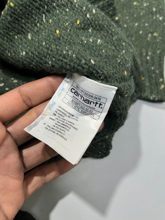 Step up your streetwear collection with this Rare Vintage Carhartt Knit Sweater — a clean and cozy speckled design in deep green, paired with the iconic Carhartt patch branding on the hem.
