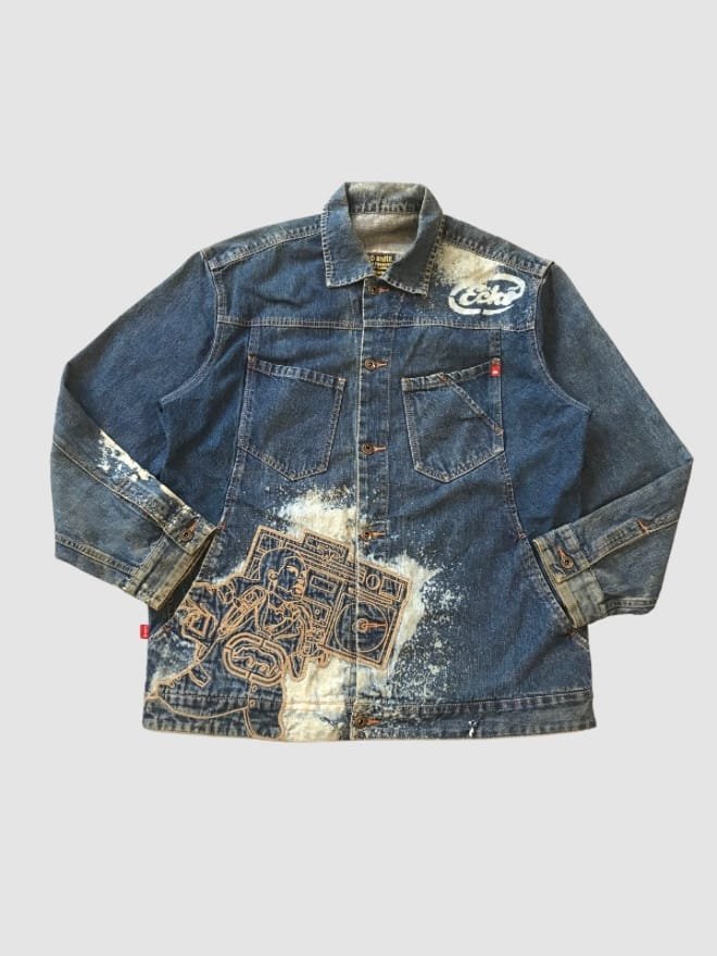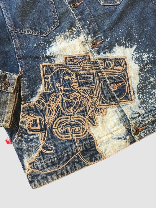 When describing a vintage Ecko Unltd. denim jacket and pant combo, it’s crucial to capture the essence of the brand’s early 2000s streetwear vibe. Here’s a description that highlights the key aspects:
