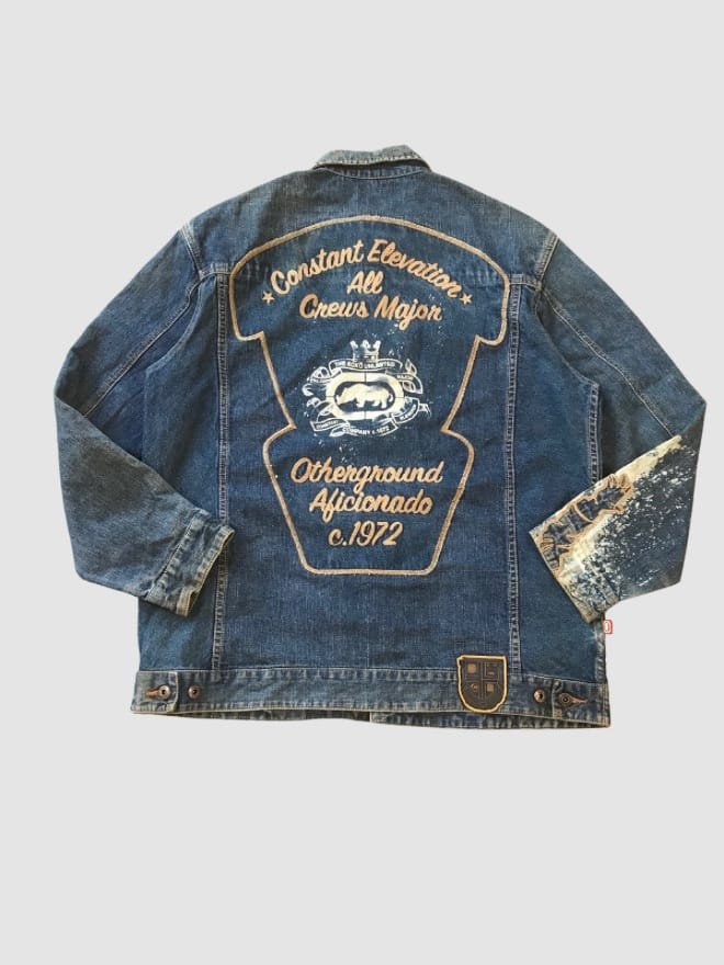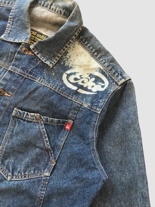 “The denim jacket and pants showcase distinctive denim washes, potential distressing, and signature Ecko Unltd. design elements.”