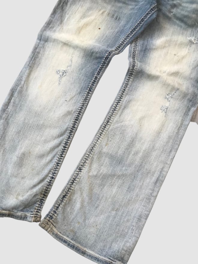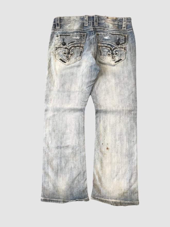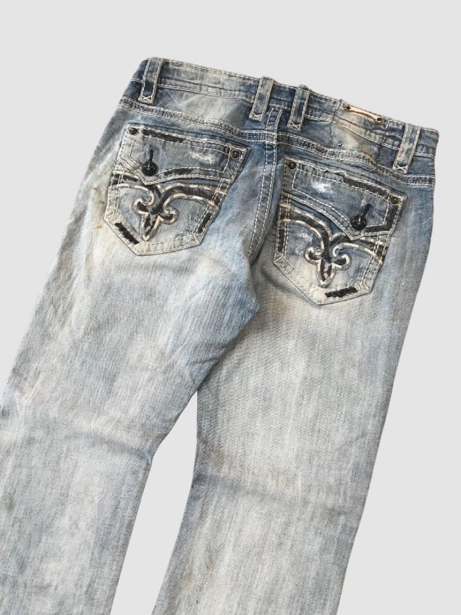 Sunfade Rock Revival Double Stitch Denim is a high-fashion denim line known for its edgy, rebellious style and intricate detailing. These jeans often feature: