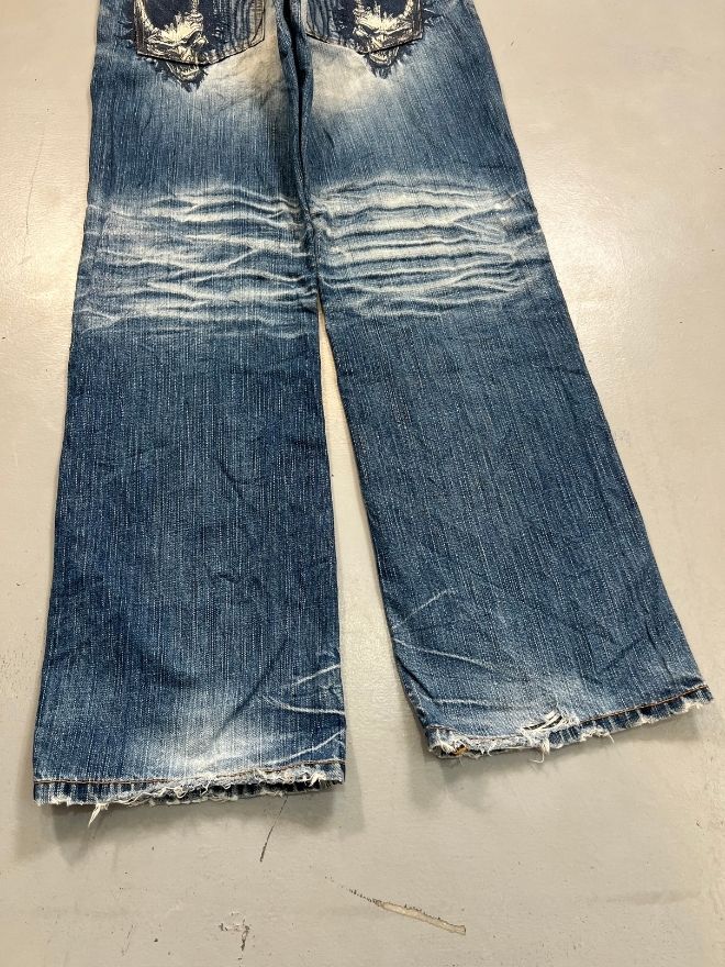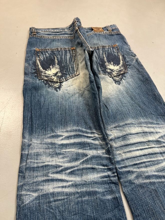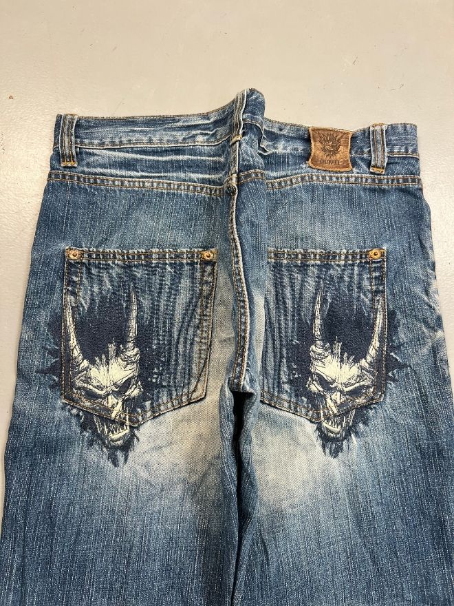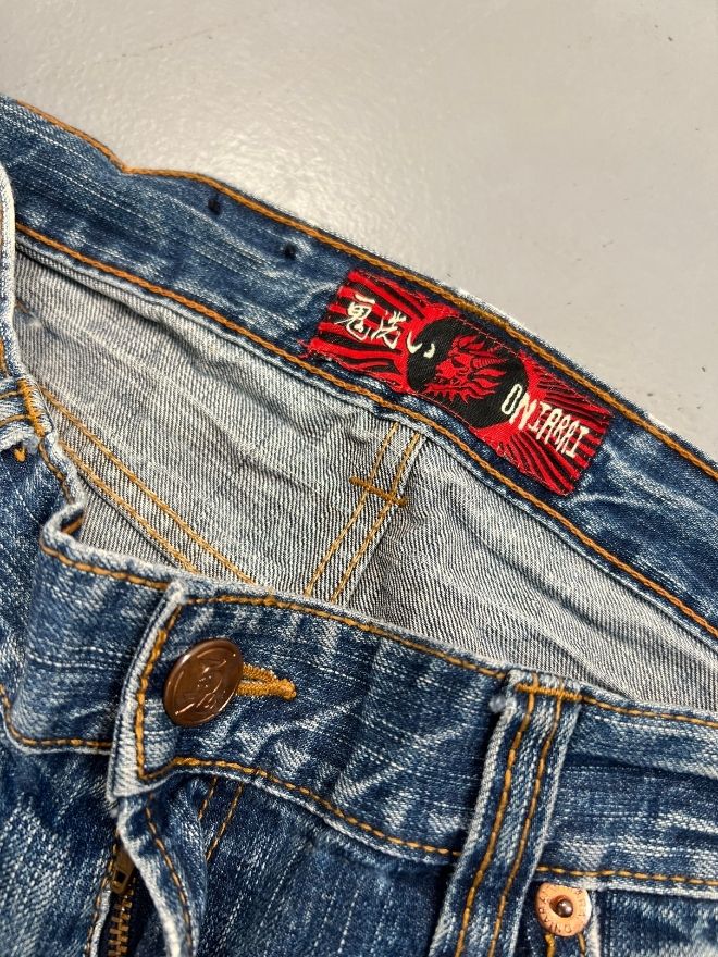This Crazy Vintage Oniarai Embroidered Japanese Denim is a standout piece showcasing traditional Japanese denim quality combined with bold, eye-catching embroidery. Known for strong fabric construction and unique detailing, Oniarai-style denim is highly appreciated by collectors and streetwear enthusiasts alike.