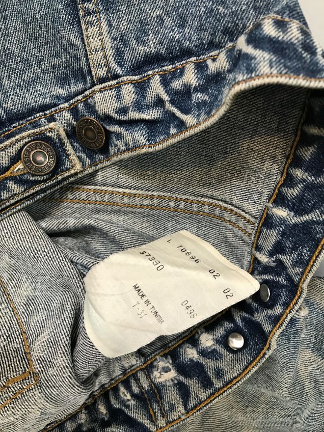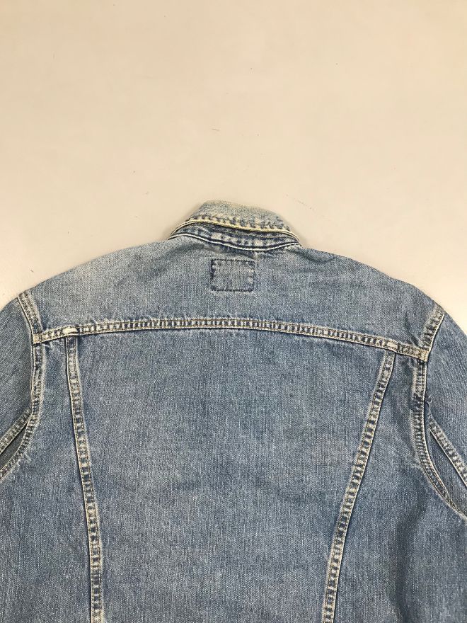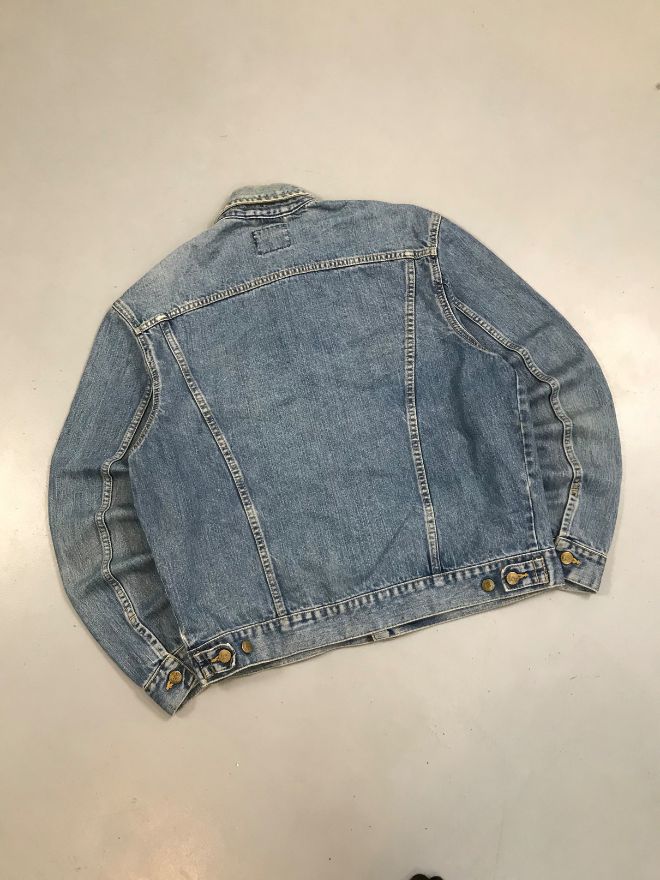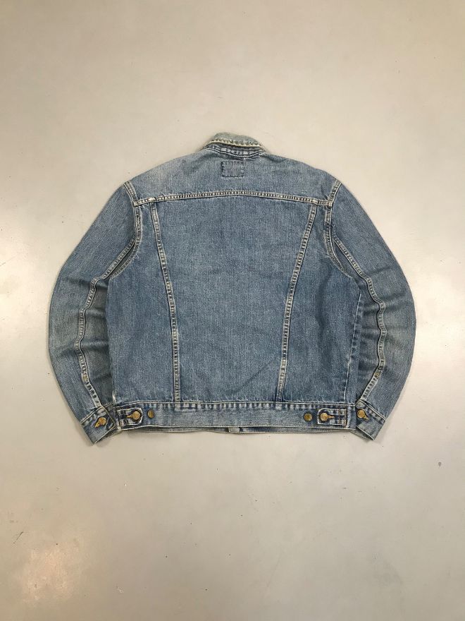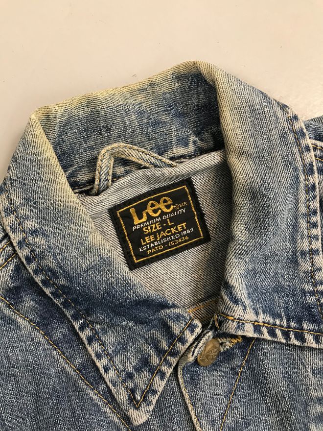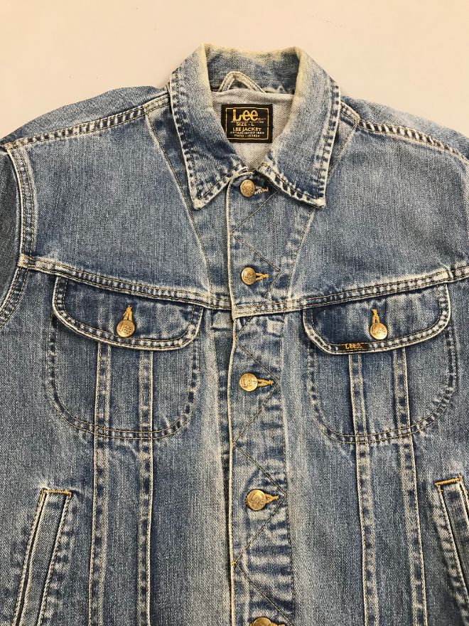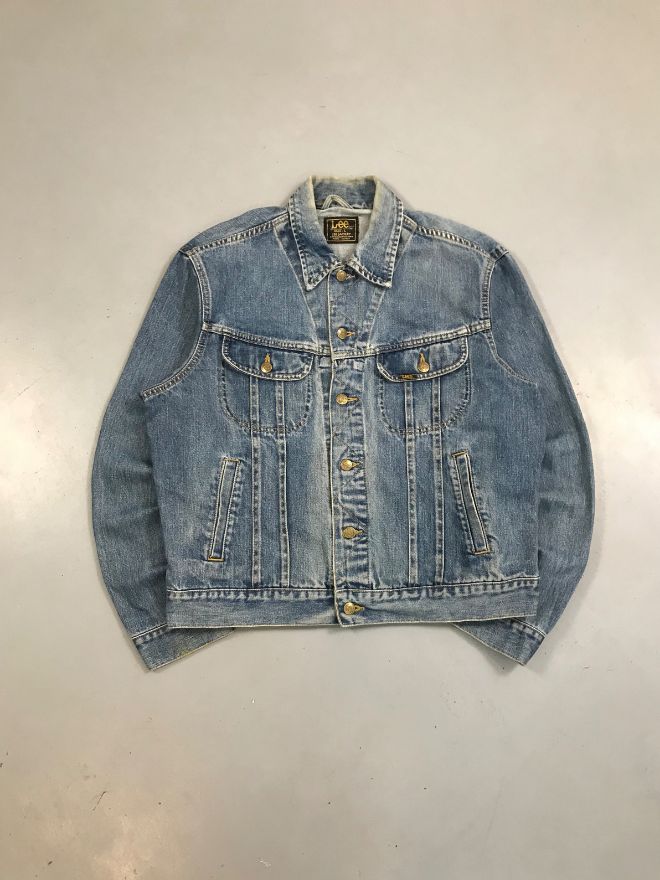 Classic late 1980s vintage Lee trucker jacket, featuring the iconic boxy silhouette, mid-blue wash, and true vintage character. A perfectly aged piece with natural wear and some visible stains, giving it that authentic retro feel. A great pick for collectors or anyone who appreciates rare Lee denim.