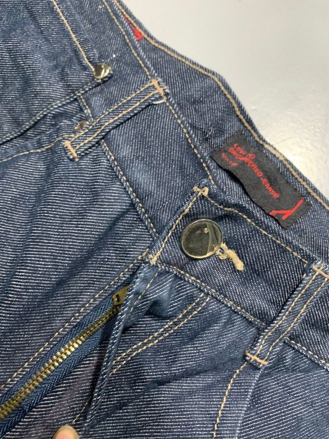 Authentic vintage Levi’s engineer jeans in classic blue denim. Size 30 with shorter 27” inseam and 38.5” total length. Comfortable condition with minor dusty stains.