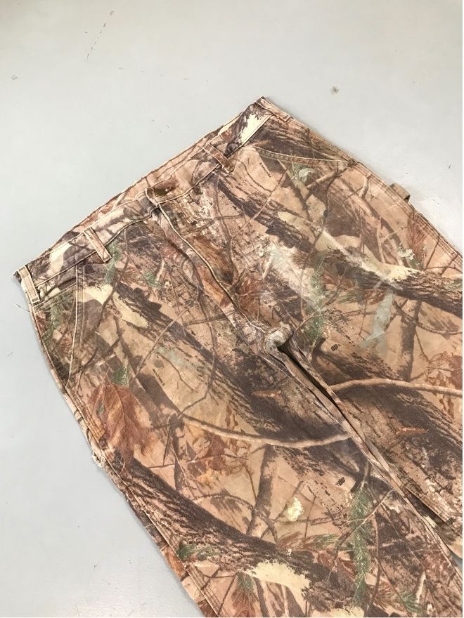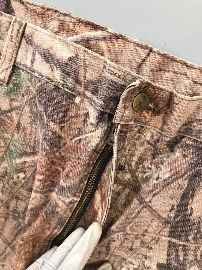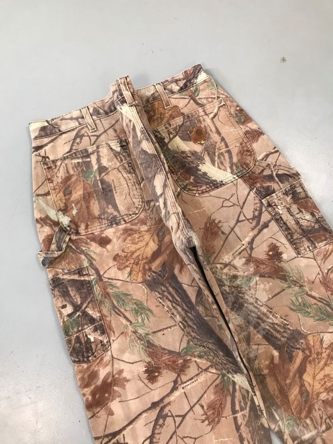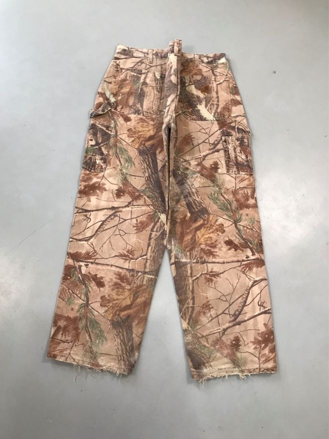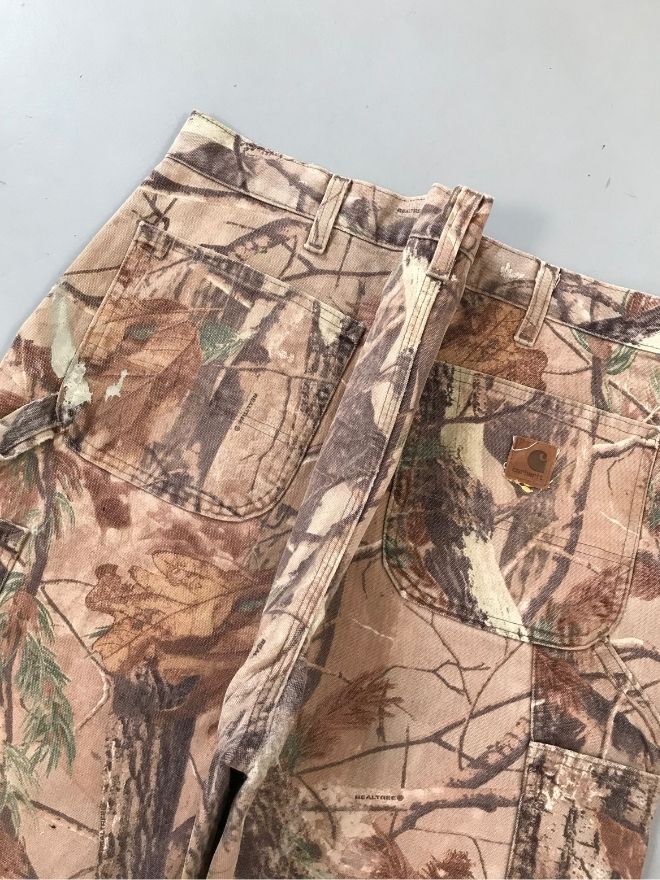 This Rare Vintage Carhartt Carpenter Denim (Model B235) features the iconic Realtree camouflage pattern — a sought-after design within workwear and vintage archives. Known for its durable heavyweight construction, reinforced seams, and functional carpenter details, this pair embodies both practicality and unique vintage character.