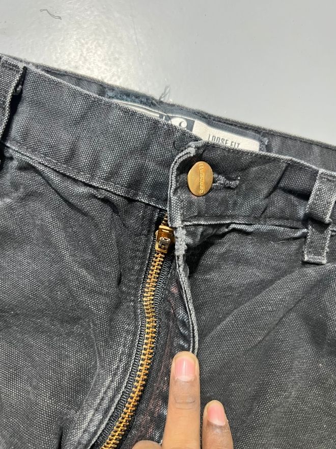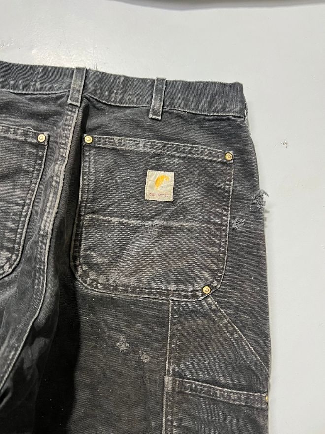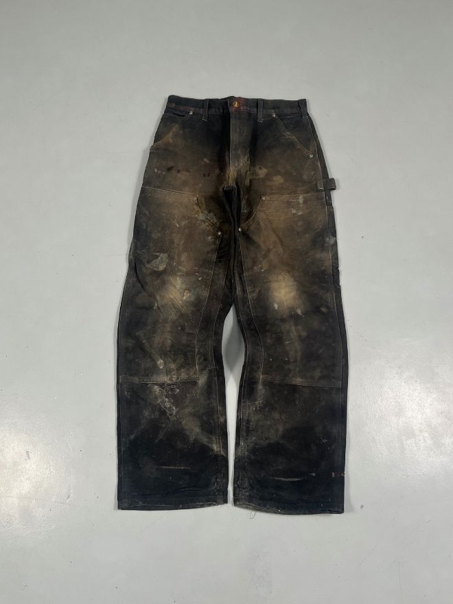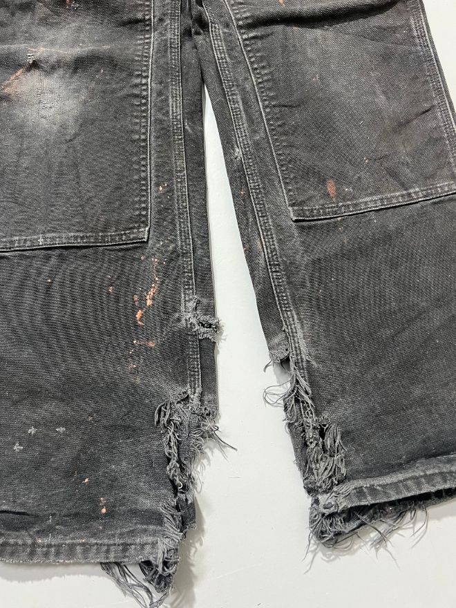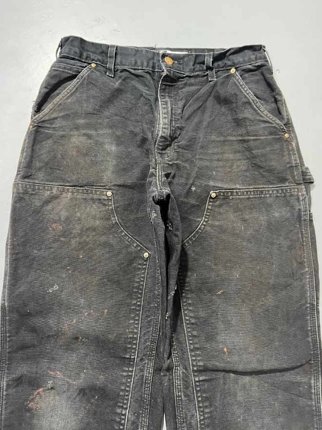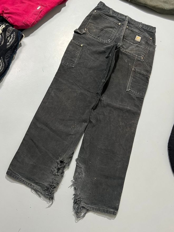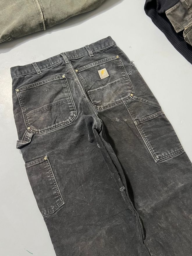 Authentic rare vintage Carhartt double knee denim, heavily thrashed and perfectly aged with natural wear throughout. Features reinforced knees, durable workwear build, and a faded black wash that gives it that true vintage character collectors love.