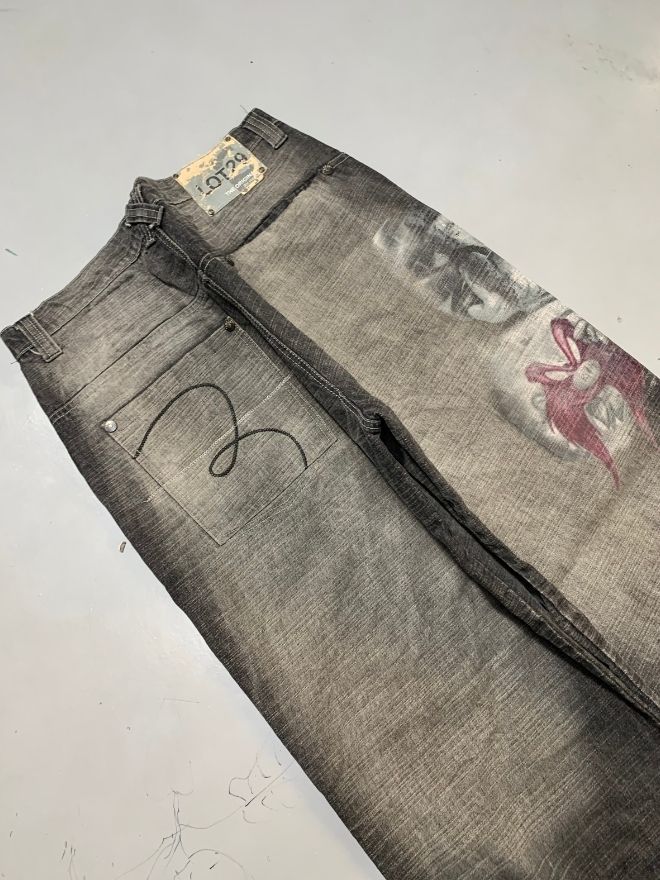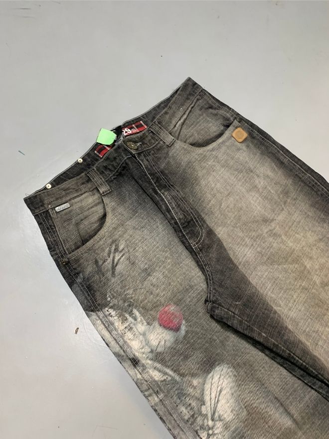 Crafted in black denim, these jeans feature eye-catching spell-out embroidery that stands out against the dark base. The wide leg opening, long 46” length, and high-rise structure create a classic baggy Y2K silhouette perfect for today’s oversized trend revival.