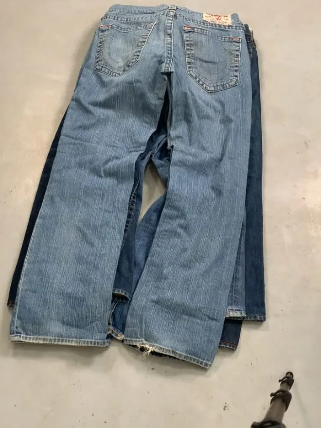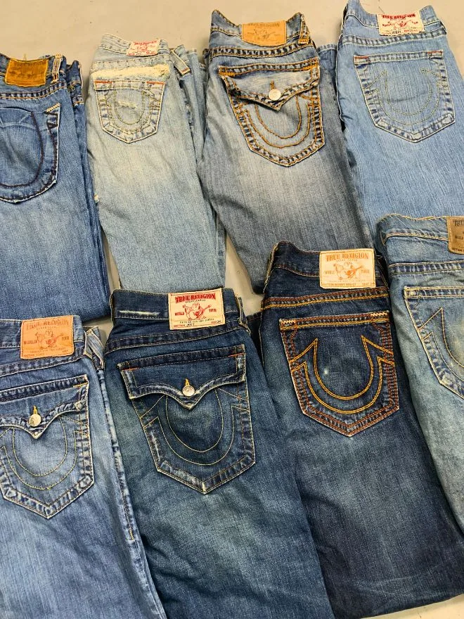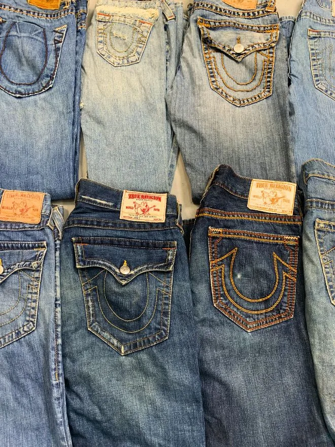 Bulk bundle of TR bootcut jeans with 80% Grade A and 20% Grade B pieces. Mixed sizes from 30 to 36, perfect for resale.
