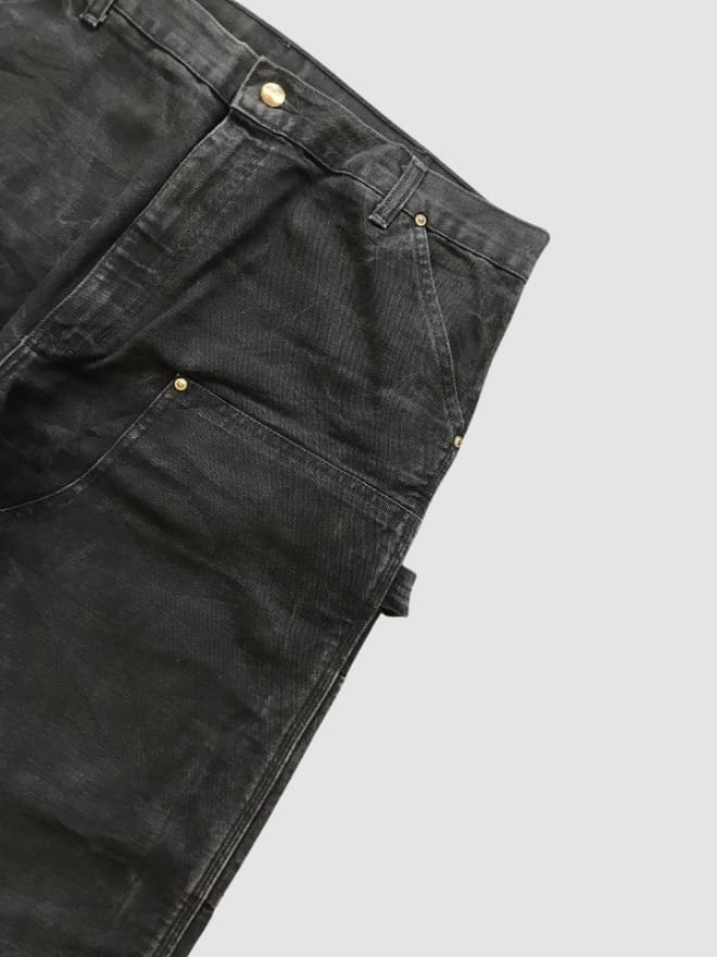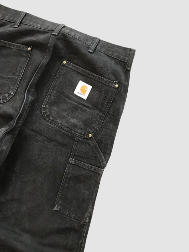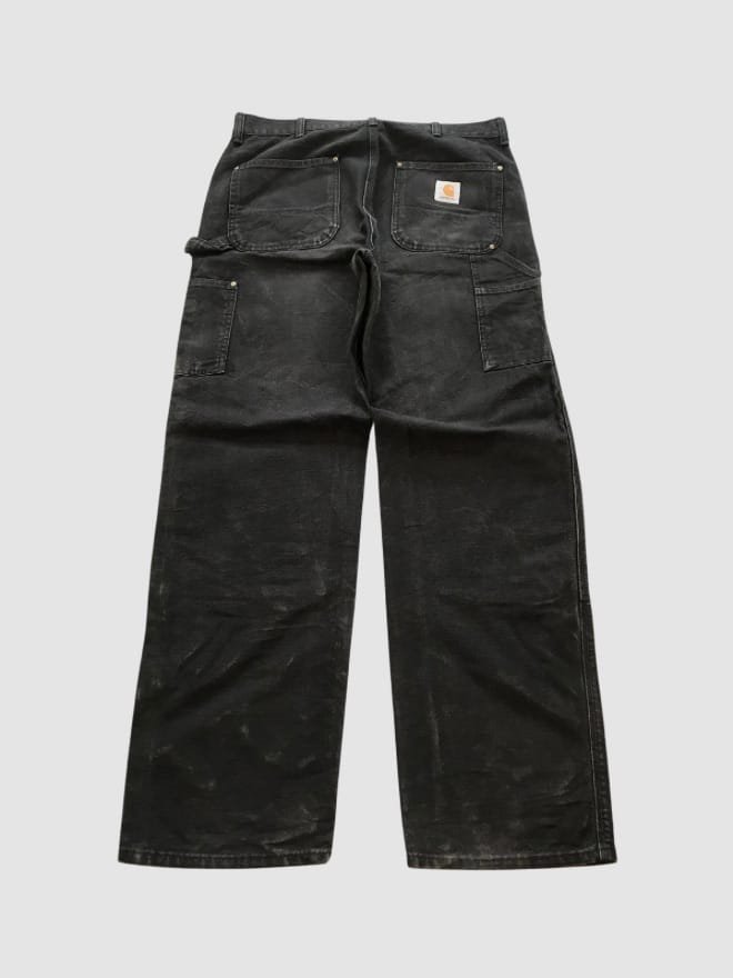 Vintage Carhartt B01 BLK Double Knee Carpenter Denim – Rugged Construction, Timeless Design. This pair of vintage Carhartt B136 BLK double knee carpenter jeans embodies Carhartt’s commitment to quality and rugged construction. The iconic double knee reinforcement provides extra durability, making these jeans perfect for work or everyday wear. [Mention any specific details like the wash, any unique wear or distressing,