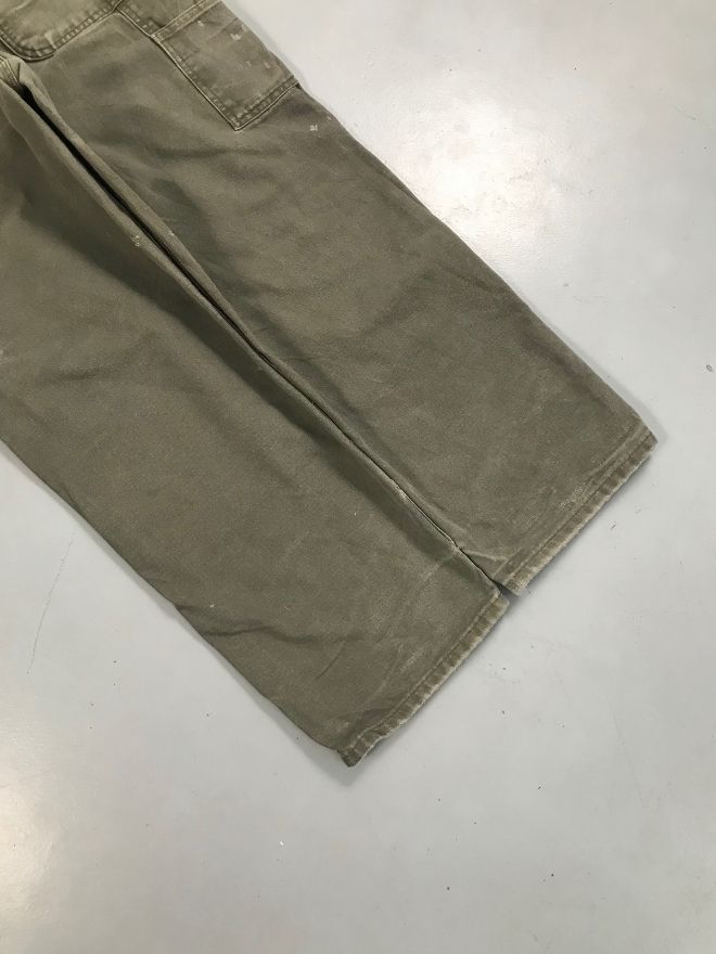 This pair shows visible distressing, repaired damages, and dusty stains that may require a deep wash or dry cleaning — all adding to its authentic worn-in patina. Ideal for collectors, workwear enthusiasts, or anyone who appreciates naturally aged fabric and raw industrial style.