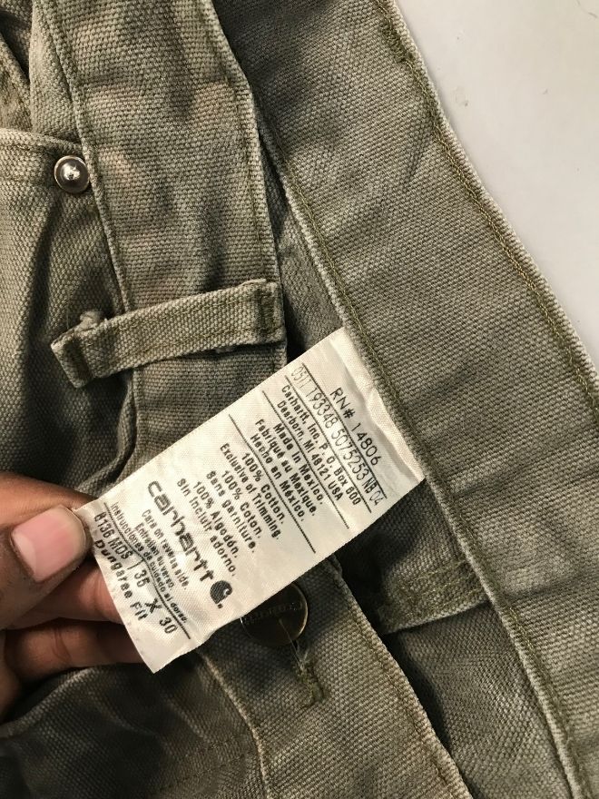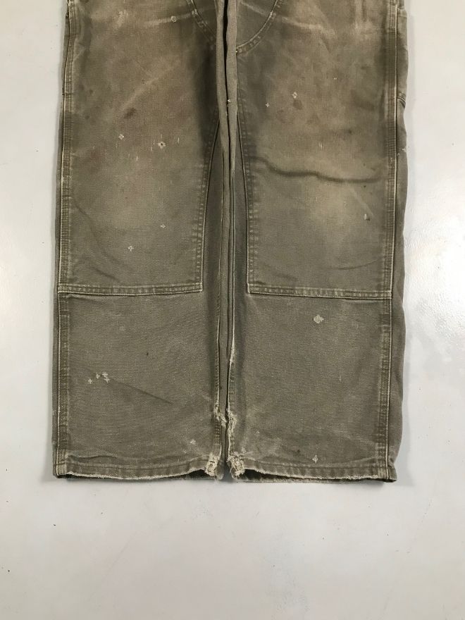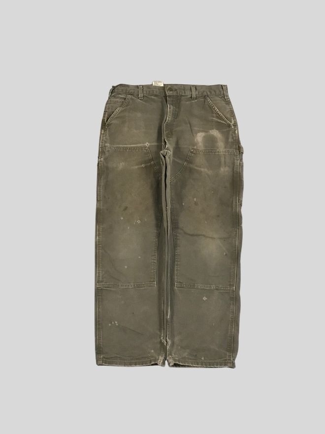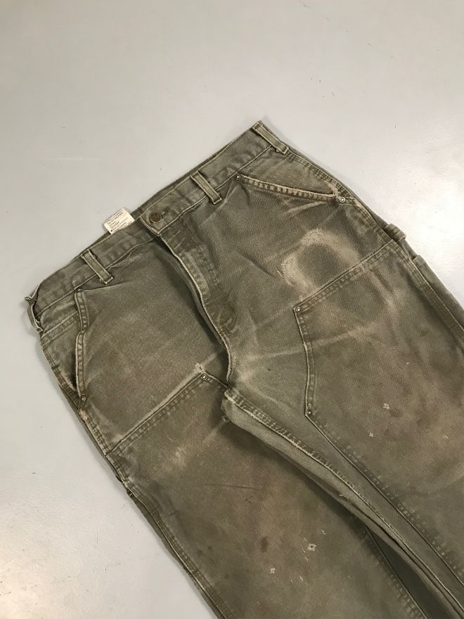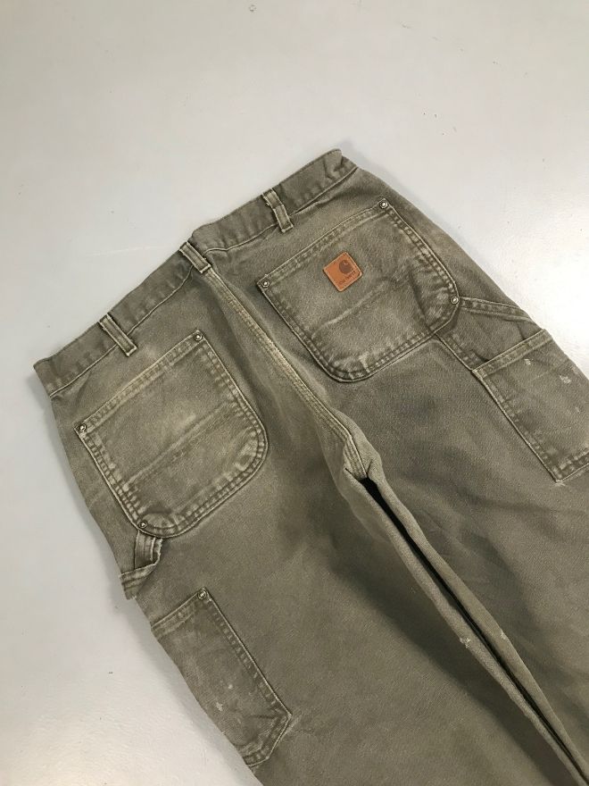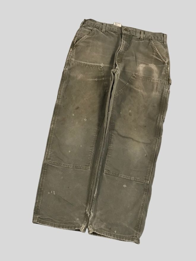 Vintage Carhartt B01 double-knee workwear pants in green denim. Men’s size US 34 (EU 50). Condition: used with visible stains, wear, and repaired areas — please review photos. Heavy-duty workwear style with character. Measurements provided. Open to offers.
