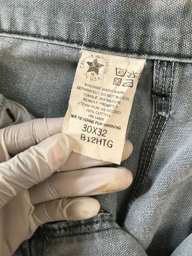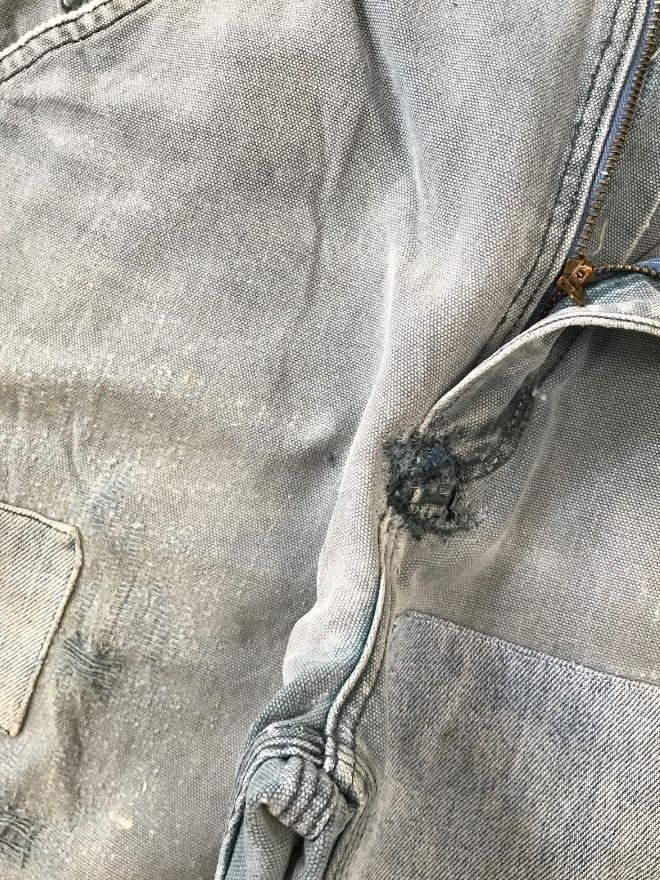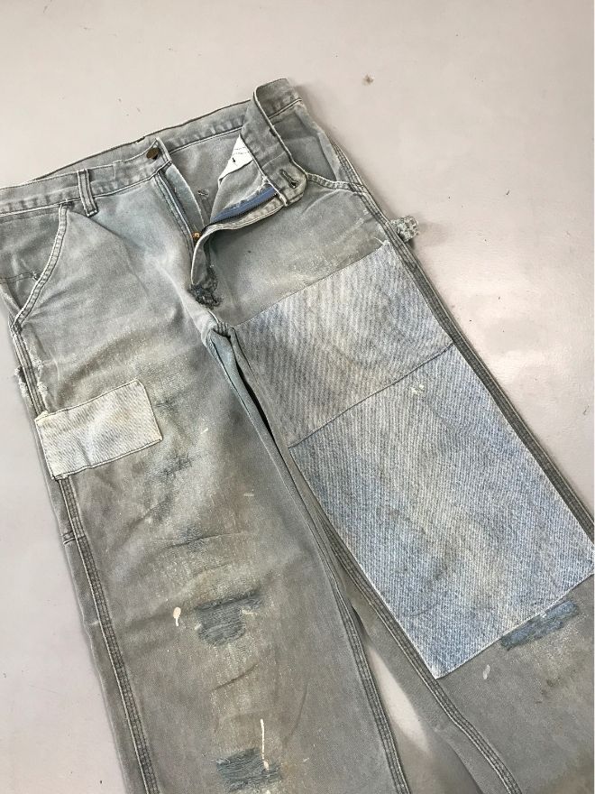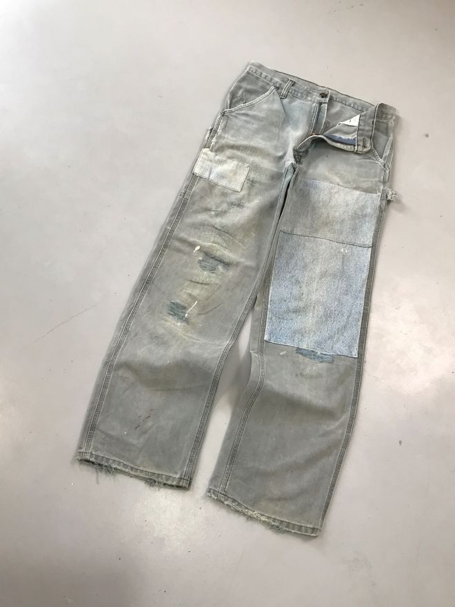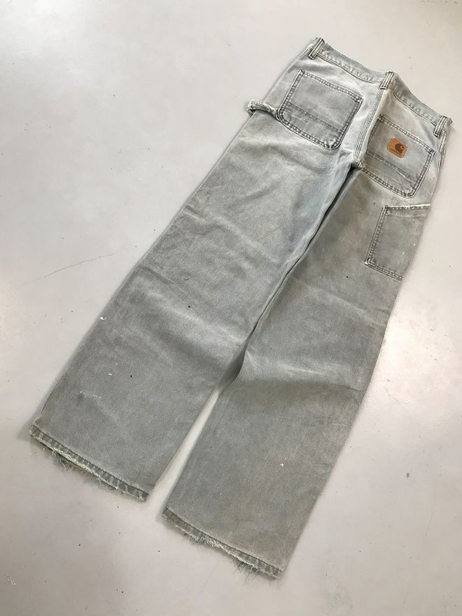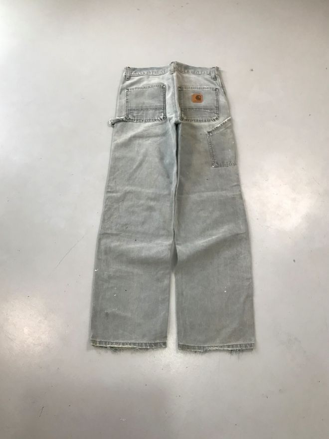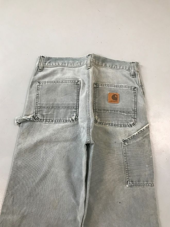 Vintage Carhartt B11 carpenter denim in rare purple wash, tagged size 30. Classic rugged workwear fit with utility pockets and hammer loop. Used condition with some dust marks, easily washable. Perfect for vintage workwear collectors and streetwear styling.