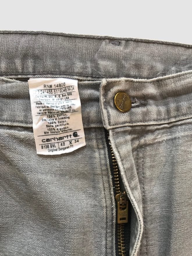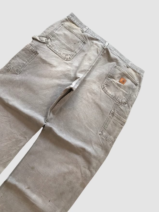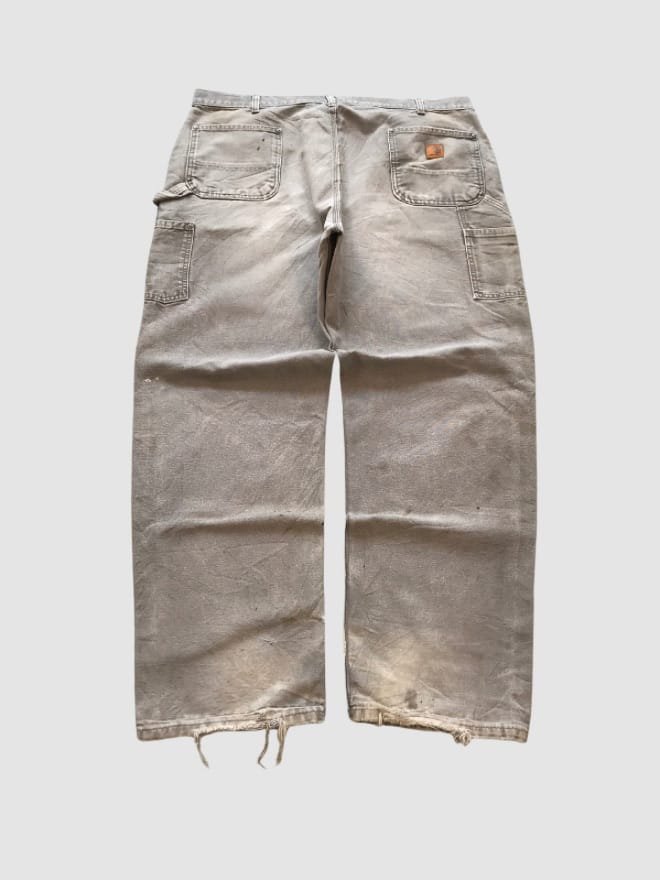 Vintage Carhartt B136 GVL Double Knee Carpenter Denim – Legendary Durability, Unique Wash. This pair of vintage Carhartt B136 GVL double knee carpenter jeans embodies Carhartt’s reputation for rugged construction and timeless design. Featuring the iconic double knee reinforcement and a unique GVL wash [describe the wash if you can – e.g., a greenish-grey, a slightly faded green, etc.], these jeans are ready for anything. [Mention any specific details like wear or distressing.]