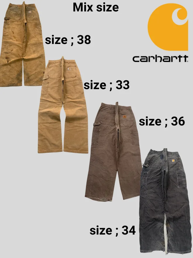 This exclusive vintage workwear bundle includes four authentic Carhartt carpenter and double knee pants sourced from Asia. Each piece carries the true character of vintage workwear — including sunfading, paint marks, repairs, and natural distressing developed through years of use.