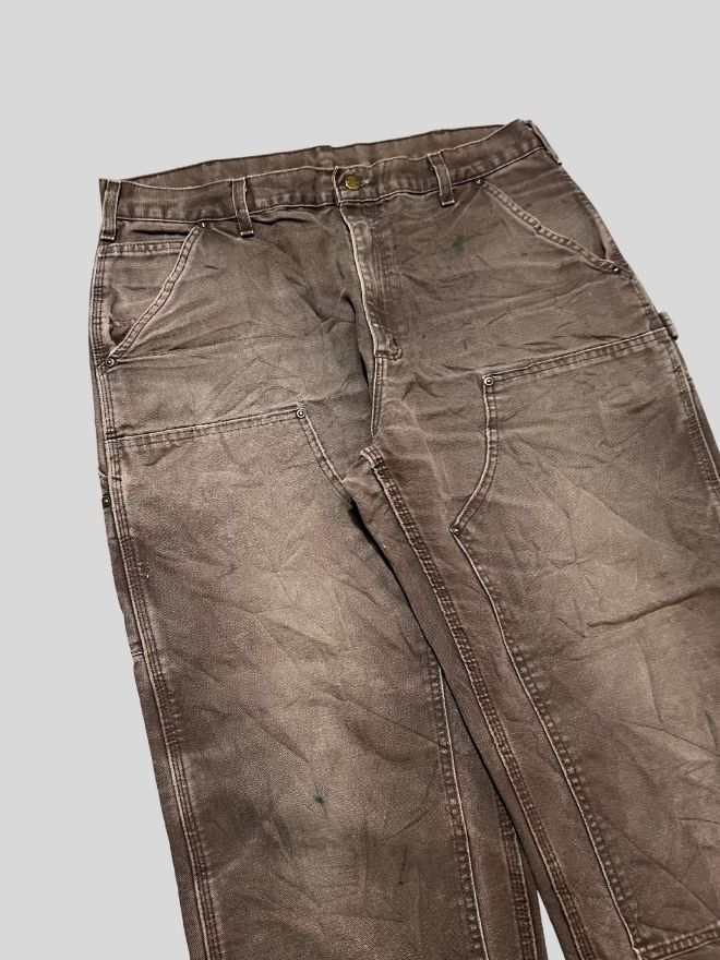 Authentic Vintage Carhartt double knee workwear denim pants in Men’s Size 36. Features a classic brown color with reinforced knees for durability. Used condition with professionally repaired minor damage. Strong, rugged fabric perfect for workwear and streetwear style.