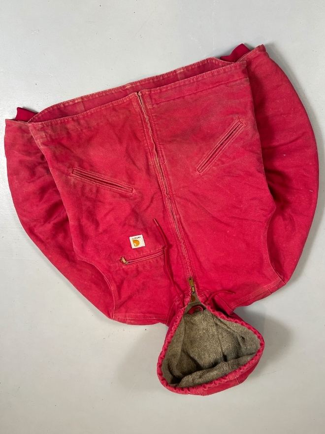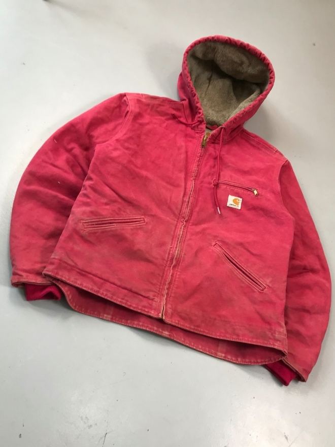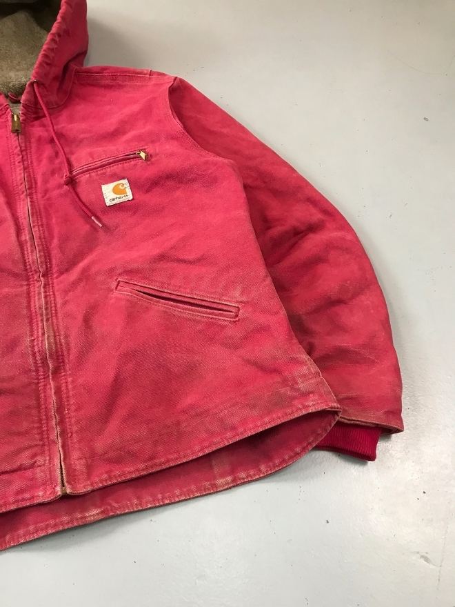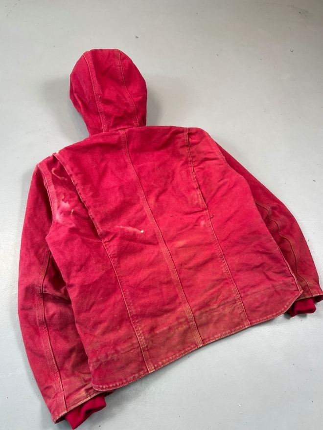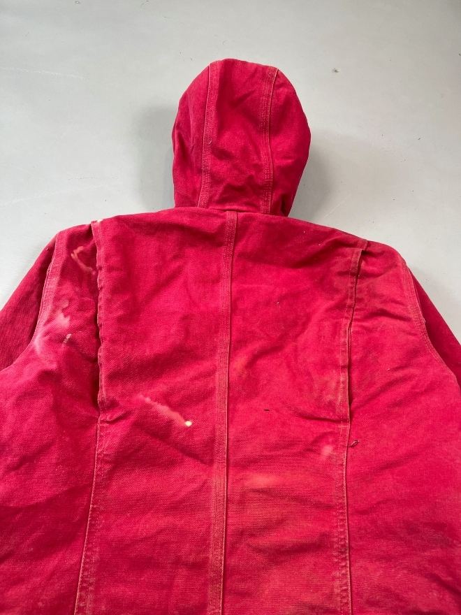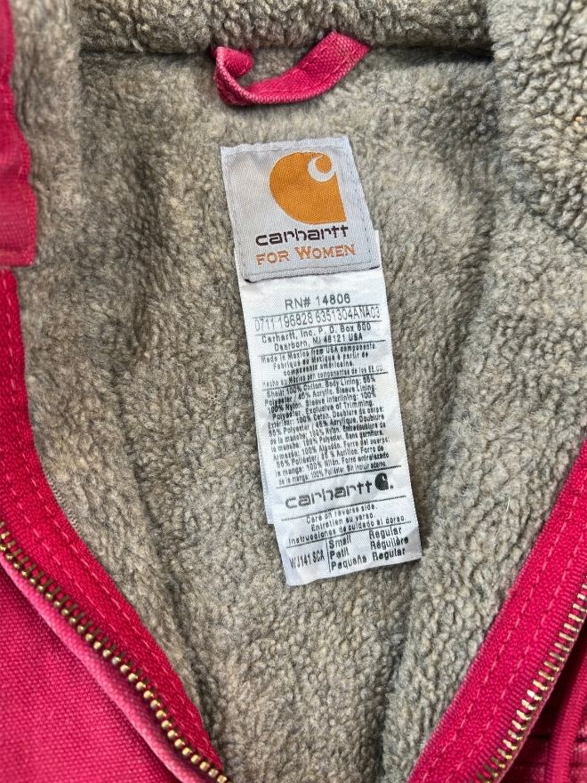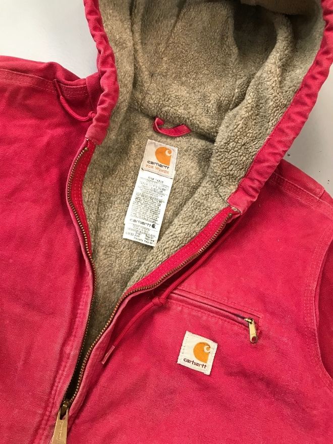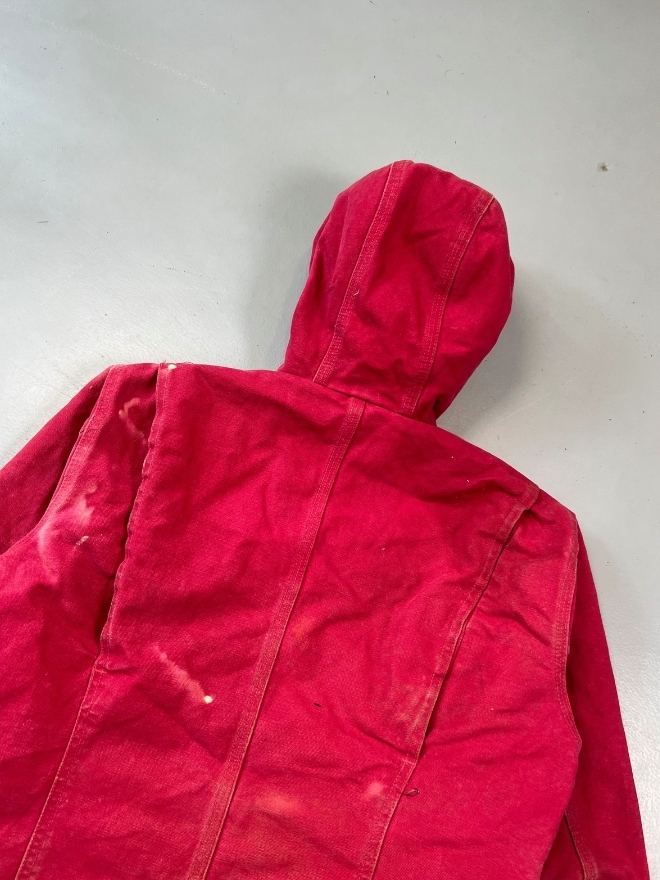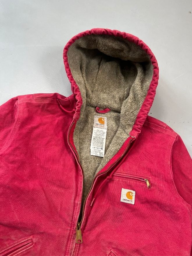 Authentic vintage Carhartt WJ141 SCA hooded, sherpa-lined jacket in red. Tagged size Small (fits Men’s US S / EU 44-46). Used condition as shown in pictures. Located in Asia. Measurements included.