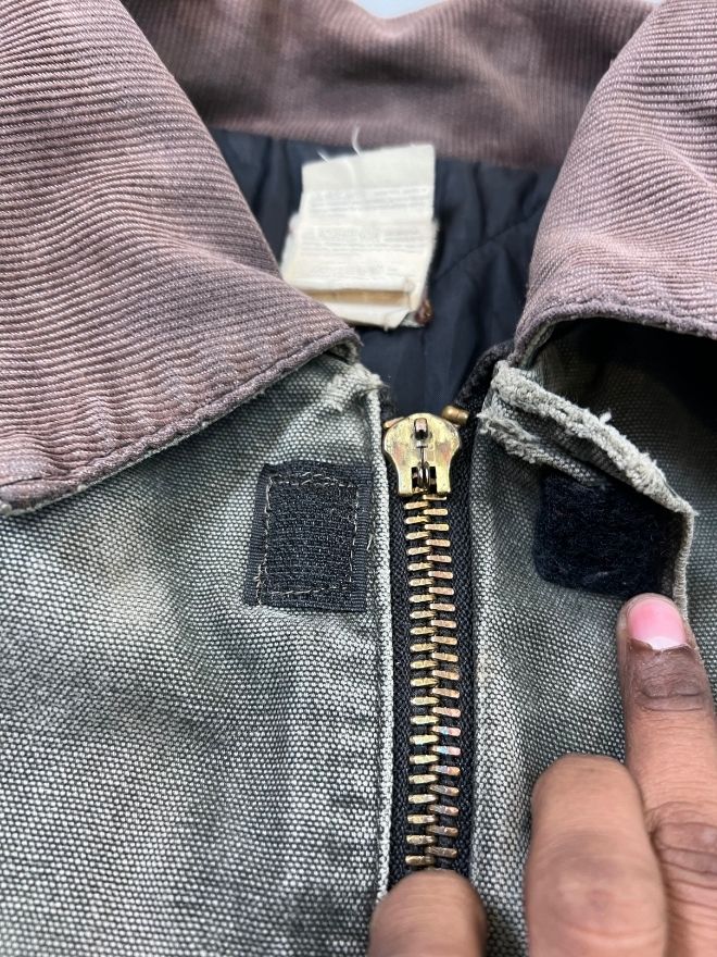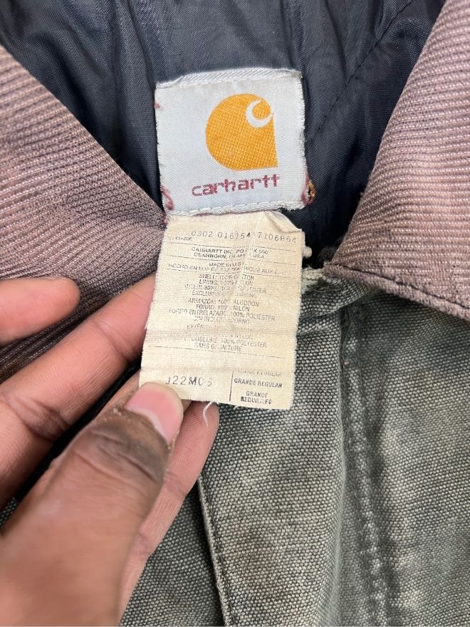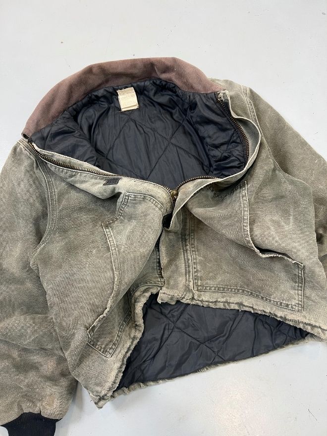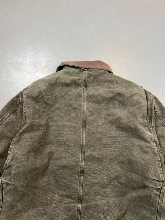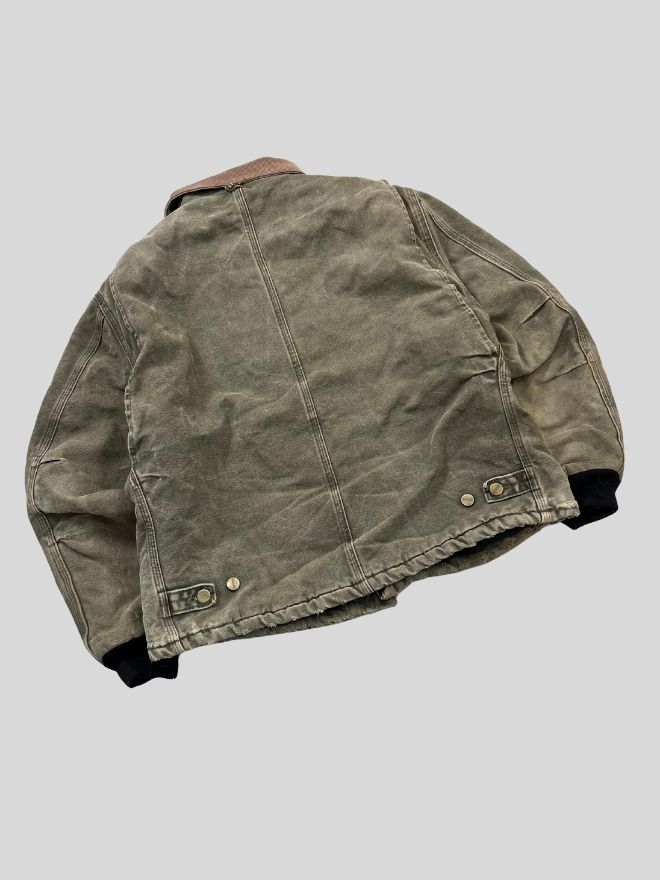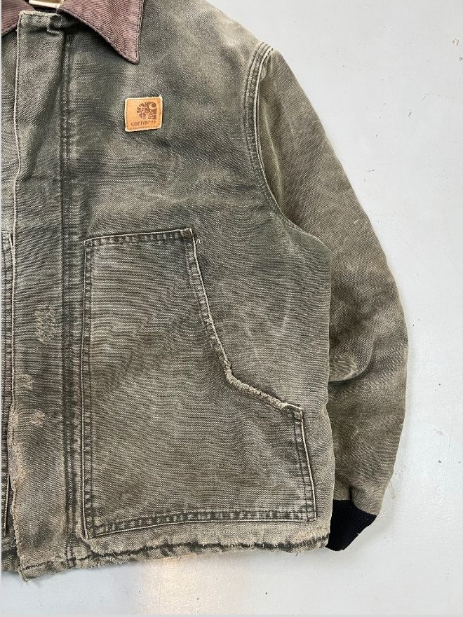 Authentic Vintage Carhartt J97 MOS Arctic quilted lined jacket in Men’s Size M. Features a classic green “Moss” color with warm quilted lining. Durable workwear design with repaired minor damages. Perfect for streetwear and casual wear.