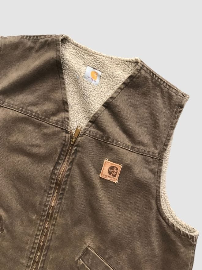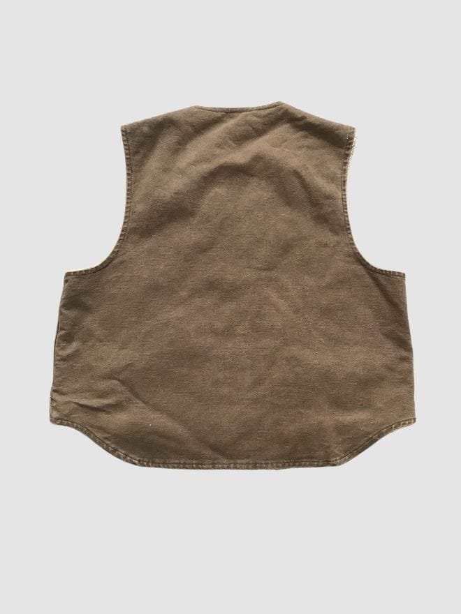 Vintage Carhartt vests often feature earthy, neutral tones that were a staple in Carhartt’s early collections. Colors like **brown**, **caramel**, **olive green**, **dark navy**, or **rust** were common, reflecting the brand’s utilitarian roots and its association with hard work. As the vest ages, these colors often fade slightly, developing a natural, worn-in appearance that gives the garment a sense of authenticity and history. Some vintage pieces may even feature subtle discoloration, light abrasions, or fraying at the seams, which only add to their unique charm.
