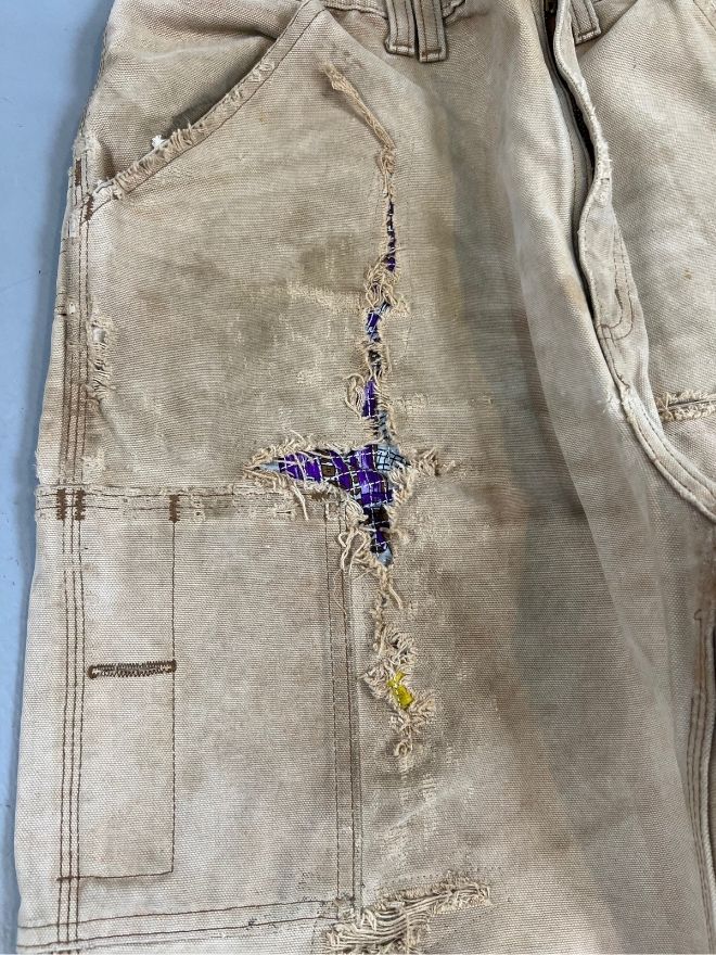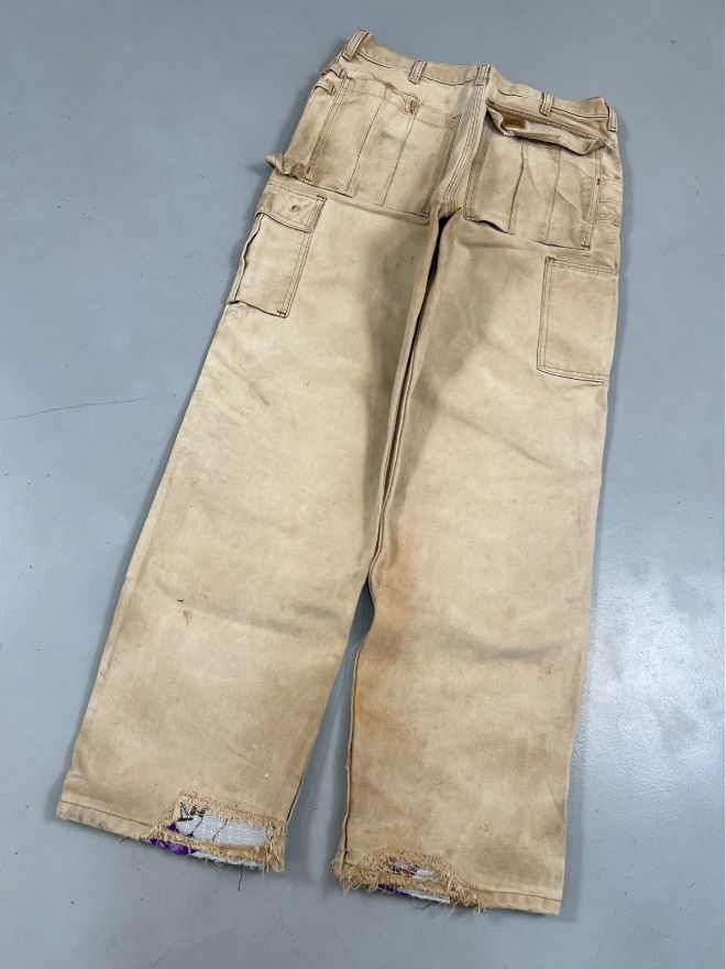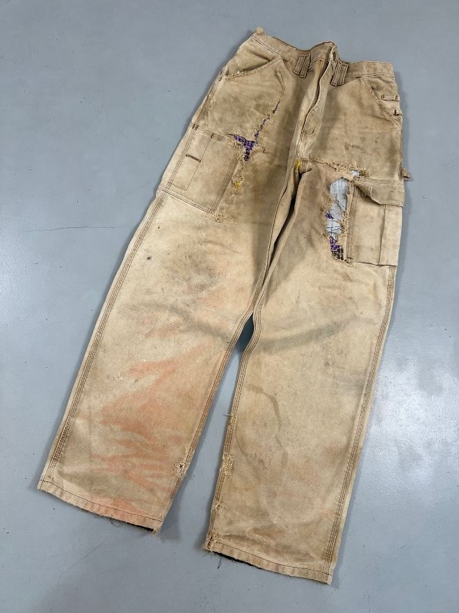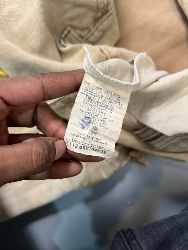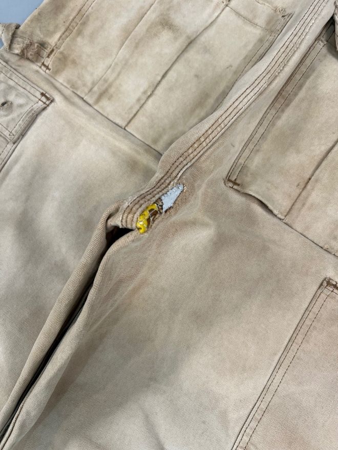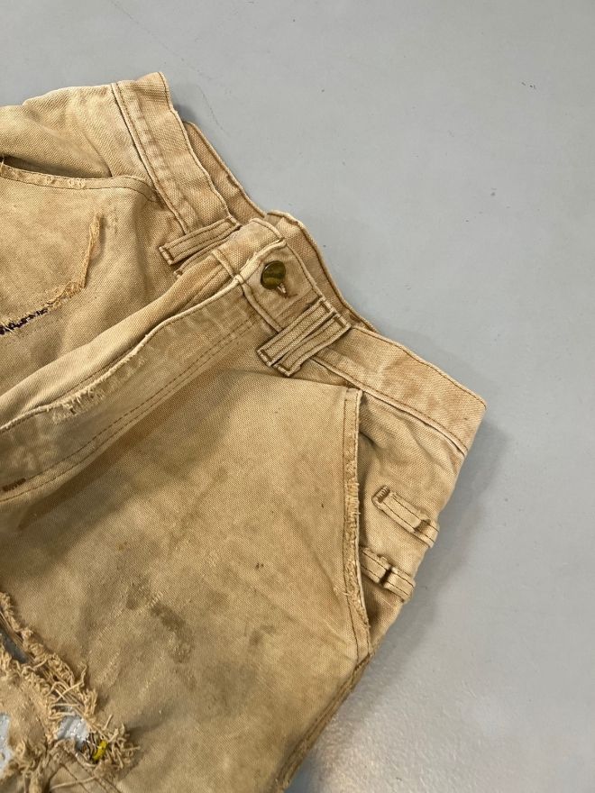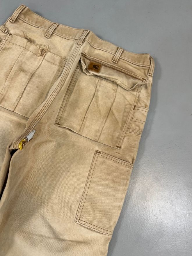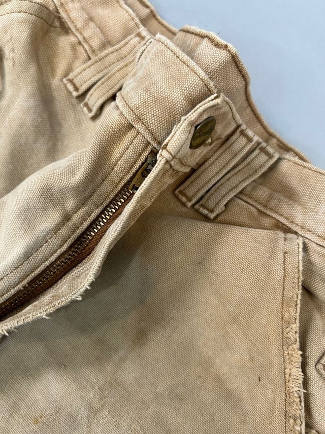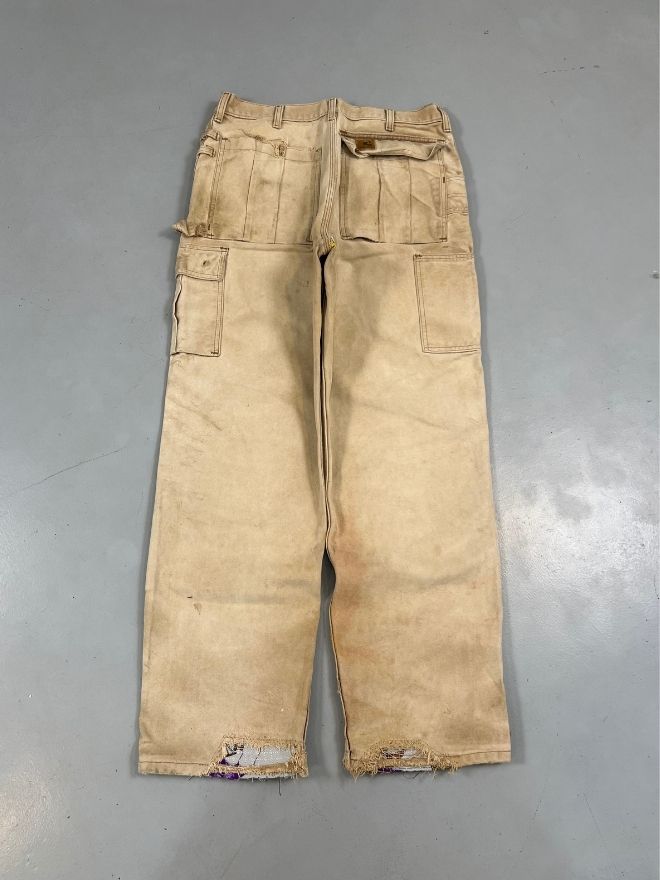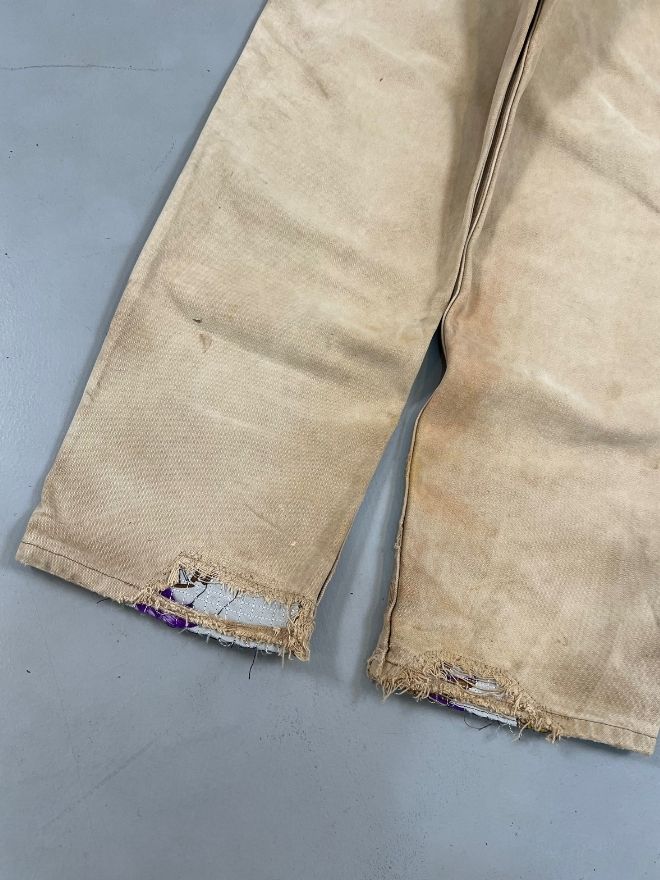 The beige tone gives it a timeless streetwear look and makes it easy to style with hoodies, work jackets, or vintage tees. The fit is comfortable and relaxed, reflecting the authentic 90s workwear cut. This piece has natural wear from age, giving it character and a lived-in feel.