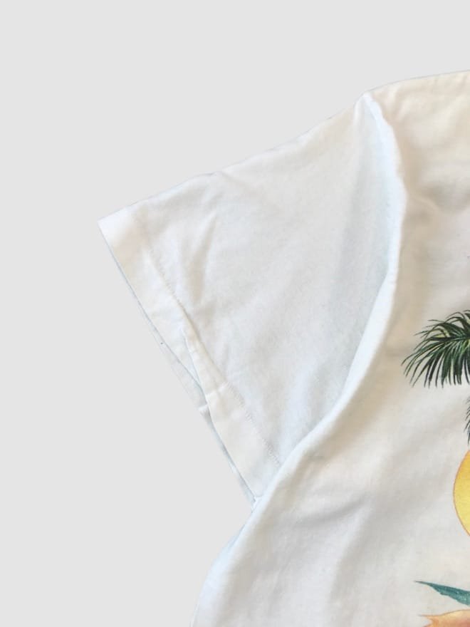 A hallmark of true vintage tees, the single stitch construction along the seams confirms the shirt’s age and authenticity.1 This detail is highly prized by collectors.