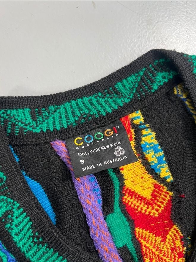 Authentic vintage Coogi 3D multicolor knit sweater in Men’s US Small / EU 44–46. Used condition with normal age wear — please review all photos. Rare, collectible textured knit design. Measurements included for accurate fit.