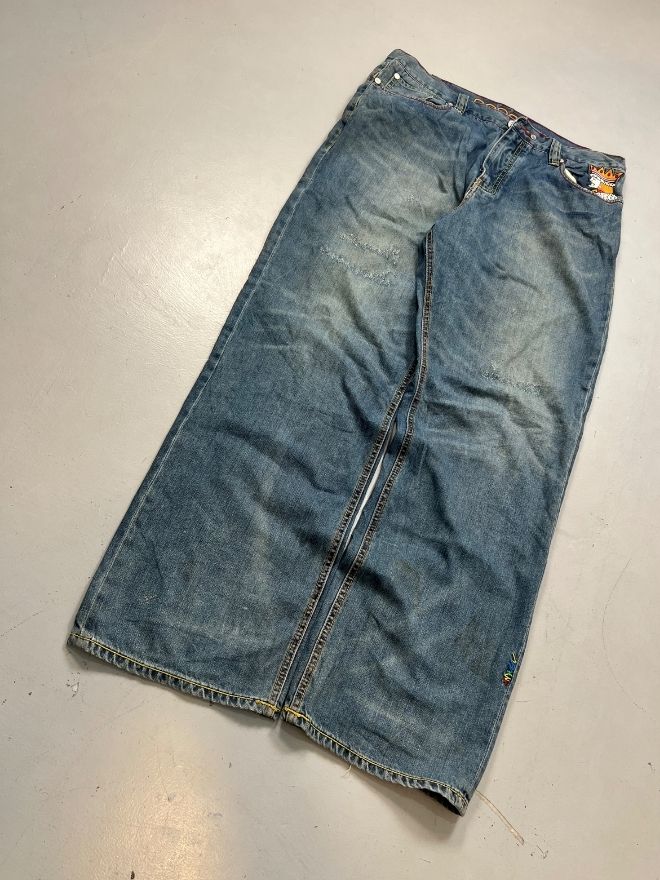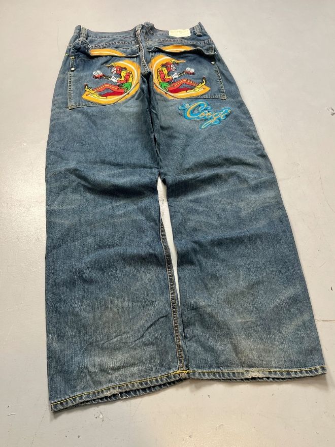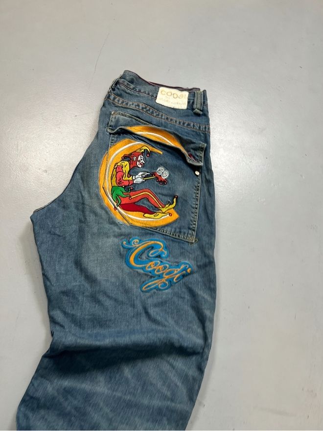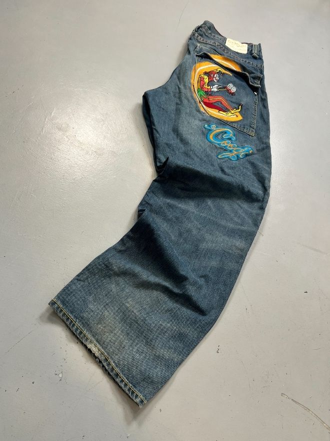 A unique and highly collectible pair of Vintage Coogi Joker Embroidered Baggy Fit Jeans, featuring vibrant multicolour embroidery and the signature oversized fit Coogi is known for. The denim has a classic blue wash with natural fading, giving it an authentic vintage character.