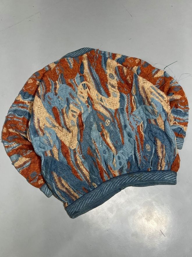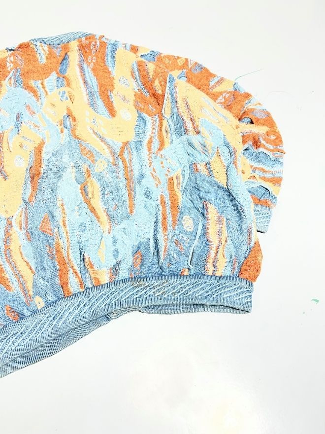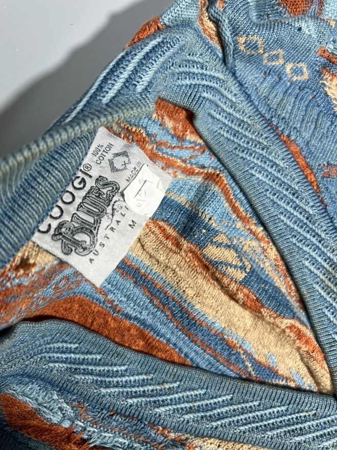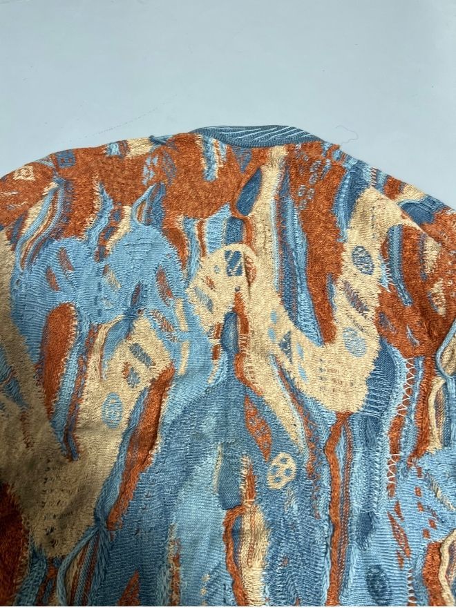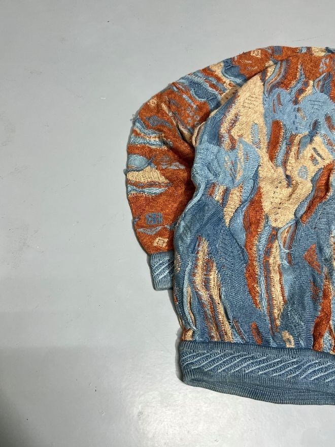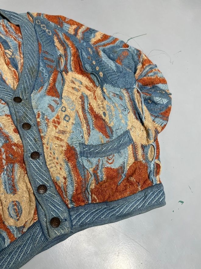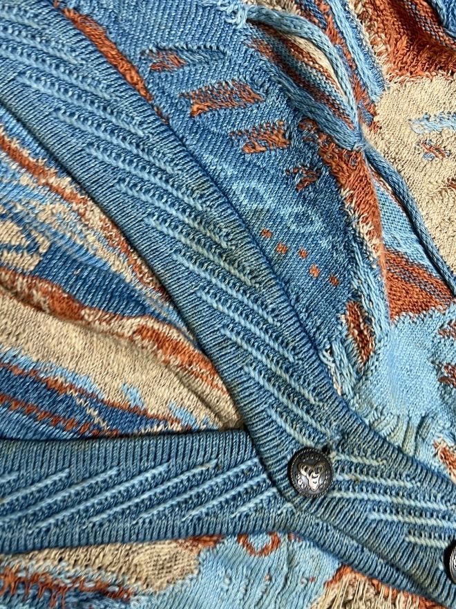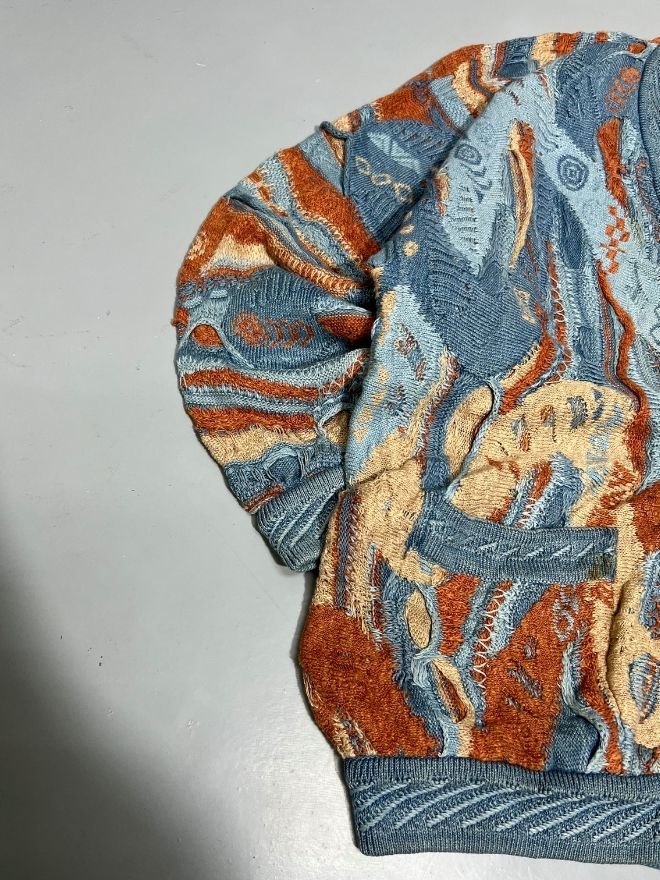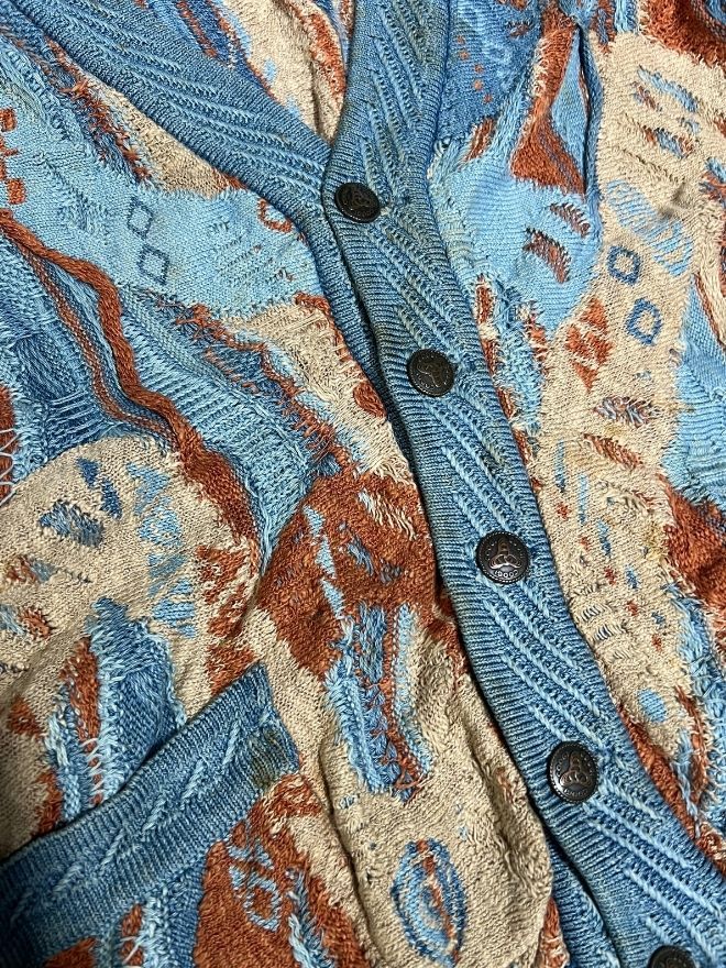 Authentic Vintage Coogi multicolor textured button-up sweater, featuring the iconic Coogi Blue palette, raised 3D knit, and vibrant patterning. A rare and collectible piece, ideal for vintage lovers and streetwear collectors.