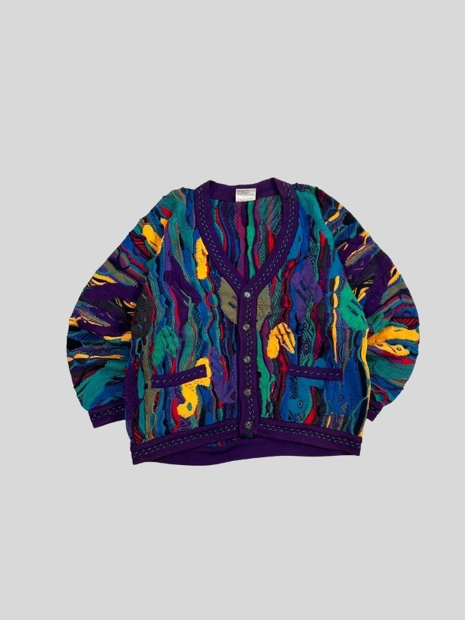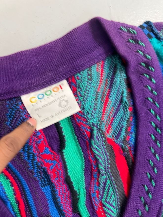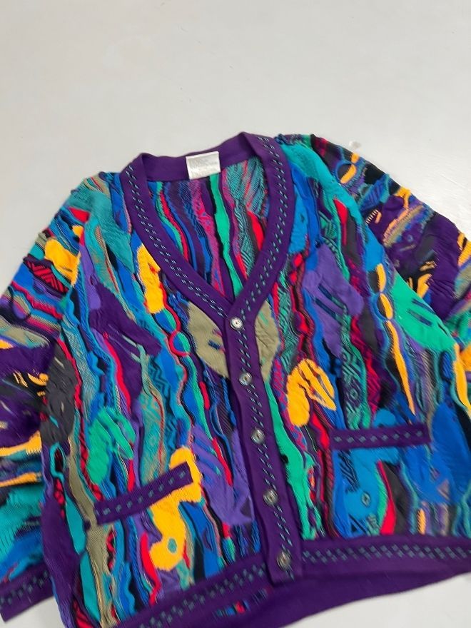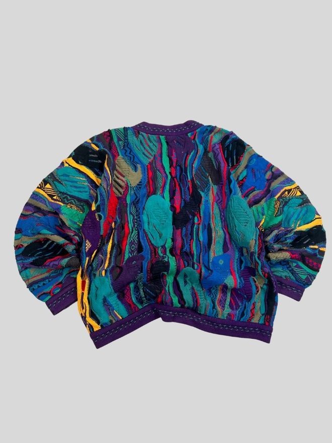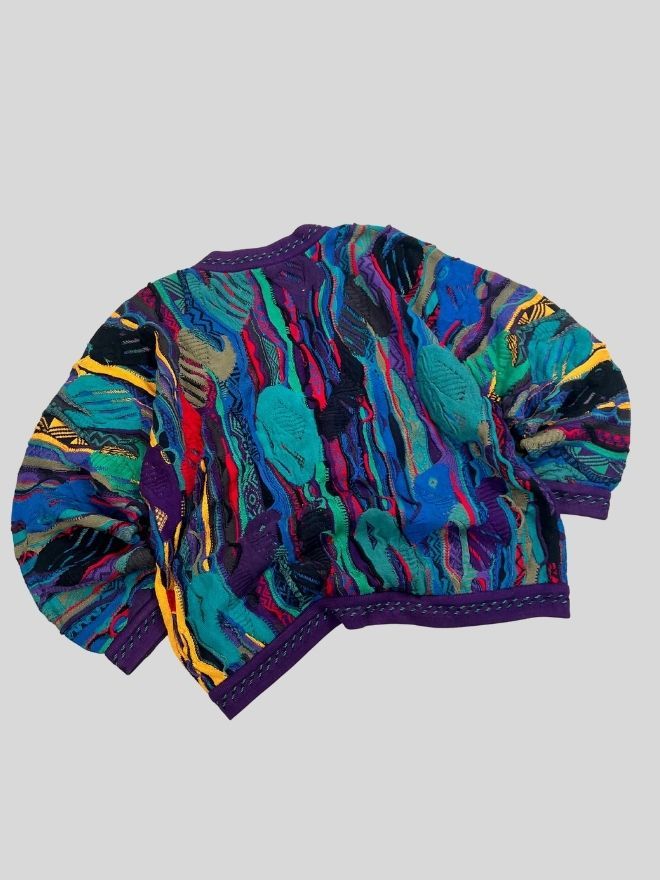 100% authentic vintage Coogi with characteristic heavy knit structure, multicolor detailing, and textured pattern.