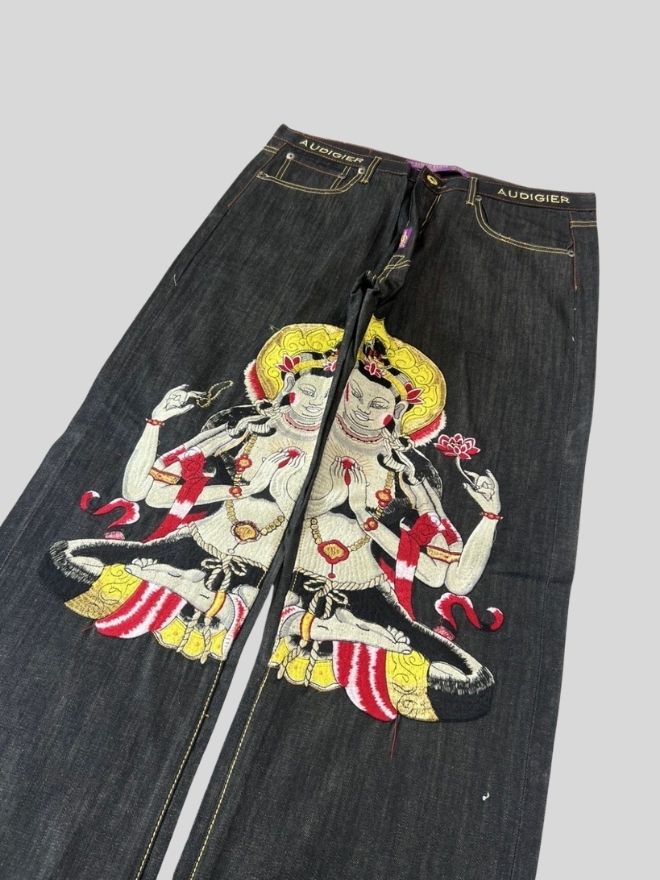 Perfect for fans of Y2K and statement street fashion, these jeans combine comfort, durability, and eye-catching design.