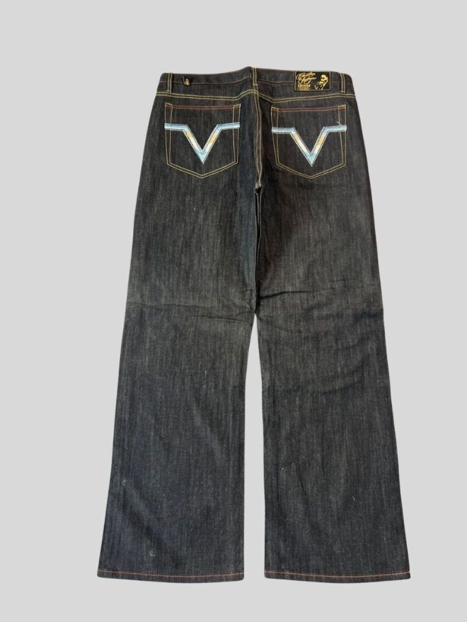 Make a bold statement with these Vintage Ed Hardy Crazy Skull Embroidered Baggy Denim Jeans. Known for its iconic tattoo-inspired graphics, Ed Hardy delivers standout streetwear style with detailed skull embroidery and oversized baggy fit.