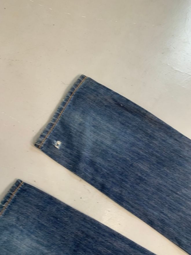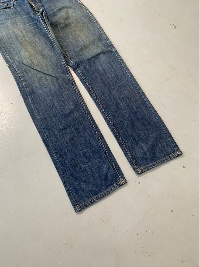 The straight-cut silhouette provides a clean and balanced profile, while the buckle belt detail adds a subtle statement touch. Crafted from durable denim fabric, this piece remains perfectly wearable and well maintained, making it a solid addition to any vintage collection.