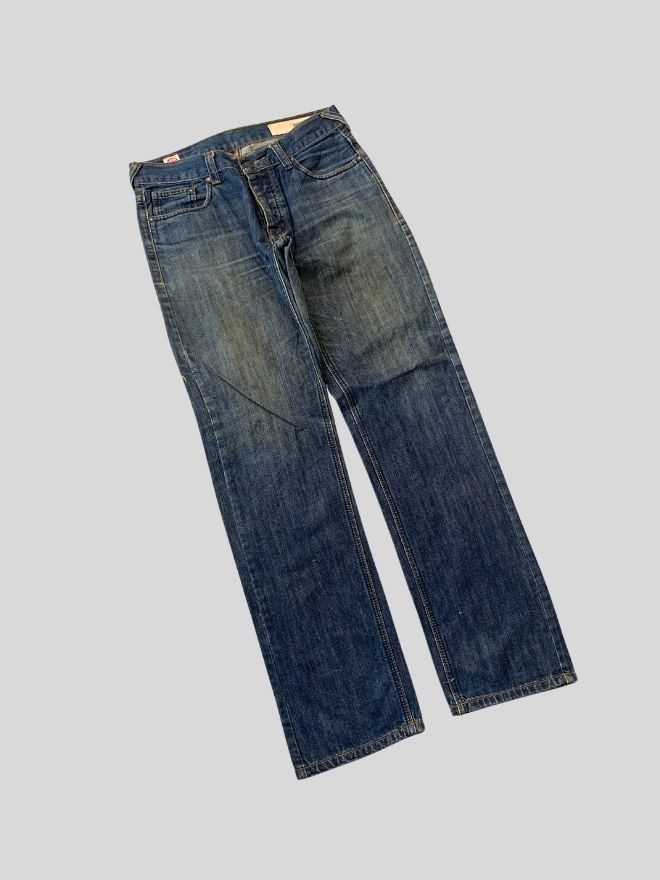 Vintage Evisu-inspired straight denim featuring the iconic seagull detail and buckle belt accent. Clean blue wash with a classic streetwear silhouette in well-maintained condition.